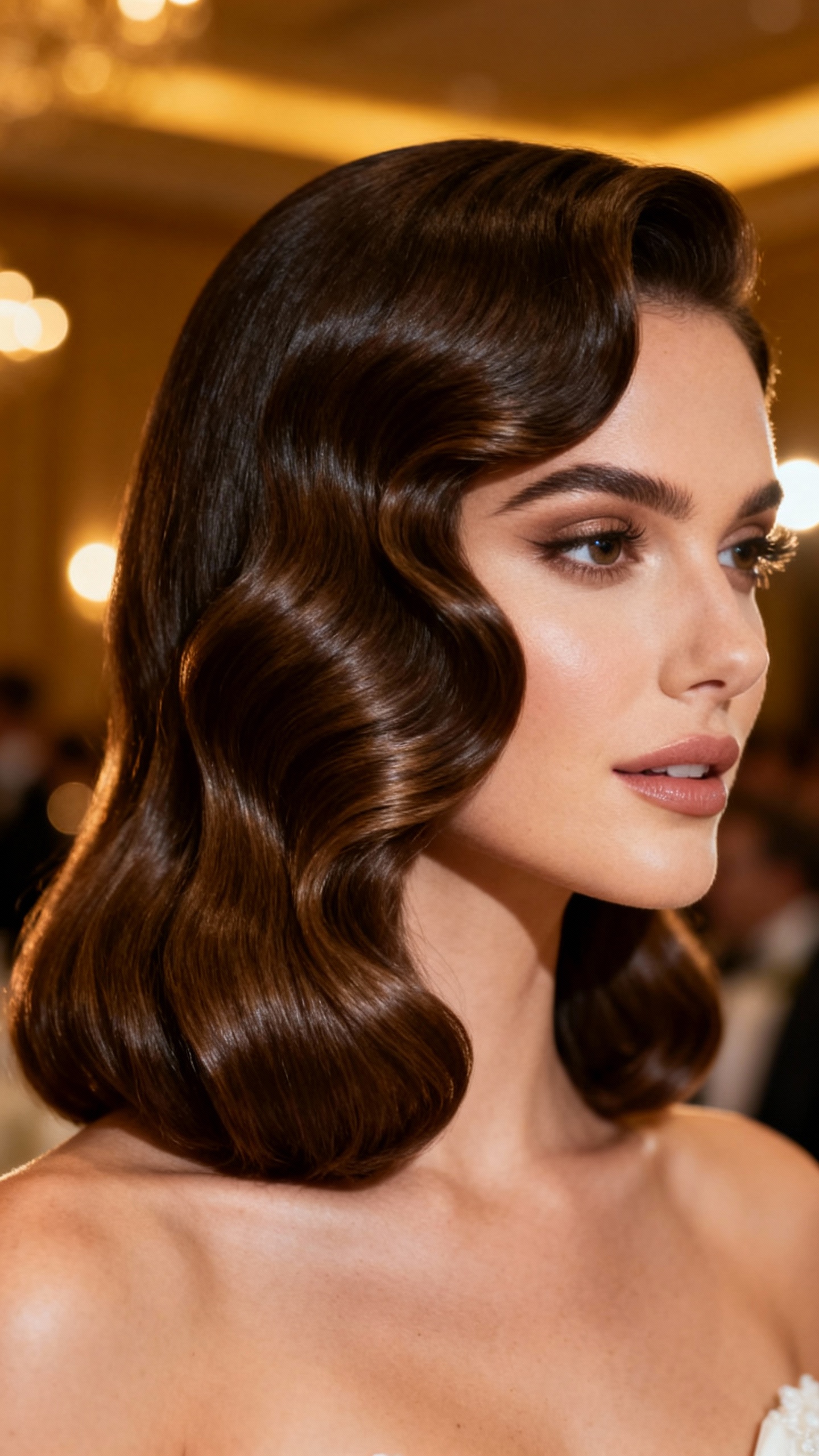 Brushed-out waves catch indoor light like a filter, especially if you add a subtle bend through the mid-lengths instead of tight curls. It flatters long faces and angular features beautifully and gives a classic, romantic energy that works for brides, bridesmaids, and guests. Practical tip: for hold in indoor warmth, set curls, let them cool fully, then brush out and finish with a flexible hairspray at the ends so it moves but doesn’t collapse in close-up photos.