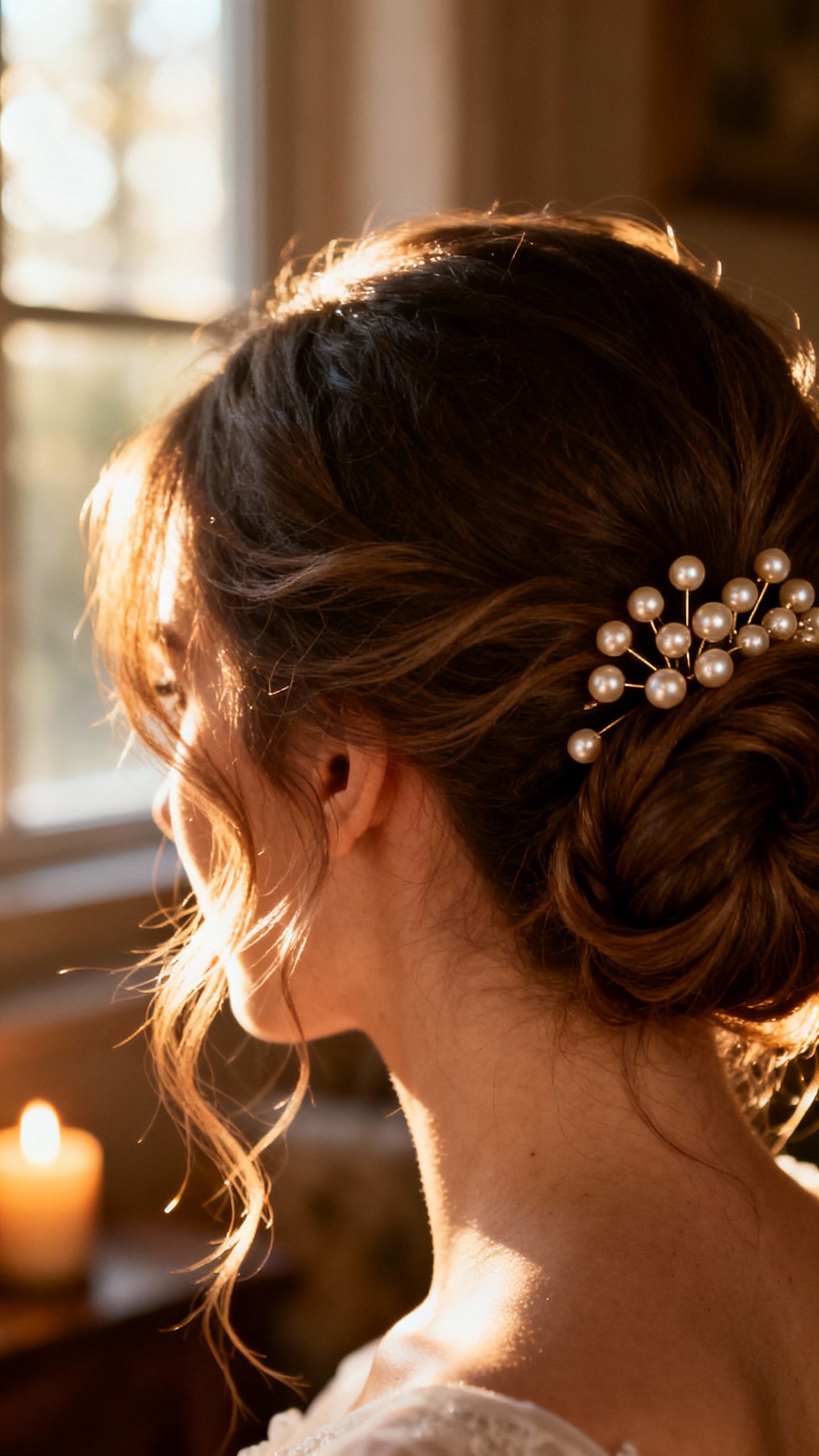 This is the cozy venue bun: soft texture, gentle volume, and little details that sparkle under warm lights. It flatters softer features and looks especially dreamy on wavy or naturally textured hair, giving an approachable, intimate vibe. Practical tip: choose pearl pins with a matte sheen (not super mirror-shiny) and place them asymmetrically around the bun so they catch light from multiple angles without overpowering your face.