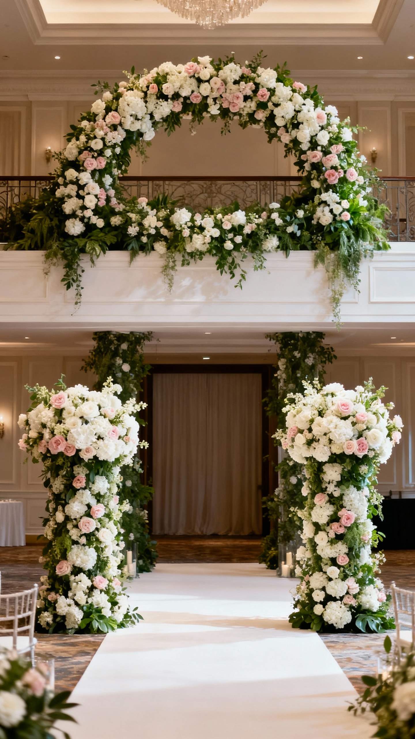 Instead of sprinkling small arrangements everywhere, concentrate your floral budget into a few “wow” installations. An elevated ceremony arch, floral columns at the aisle start, or a lush head table runner reads more luxurious than many mini centerpieces. Choose larger blooms (and plenty of greens) for scale, and reuse ceremony pieces behind the sweetheart table to maximize impact.