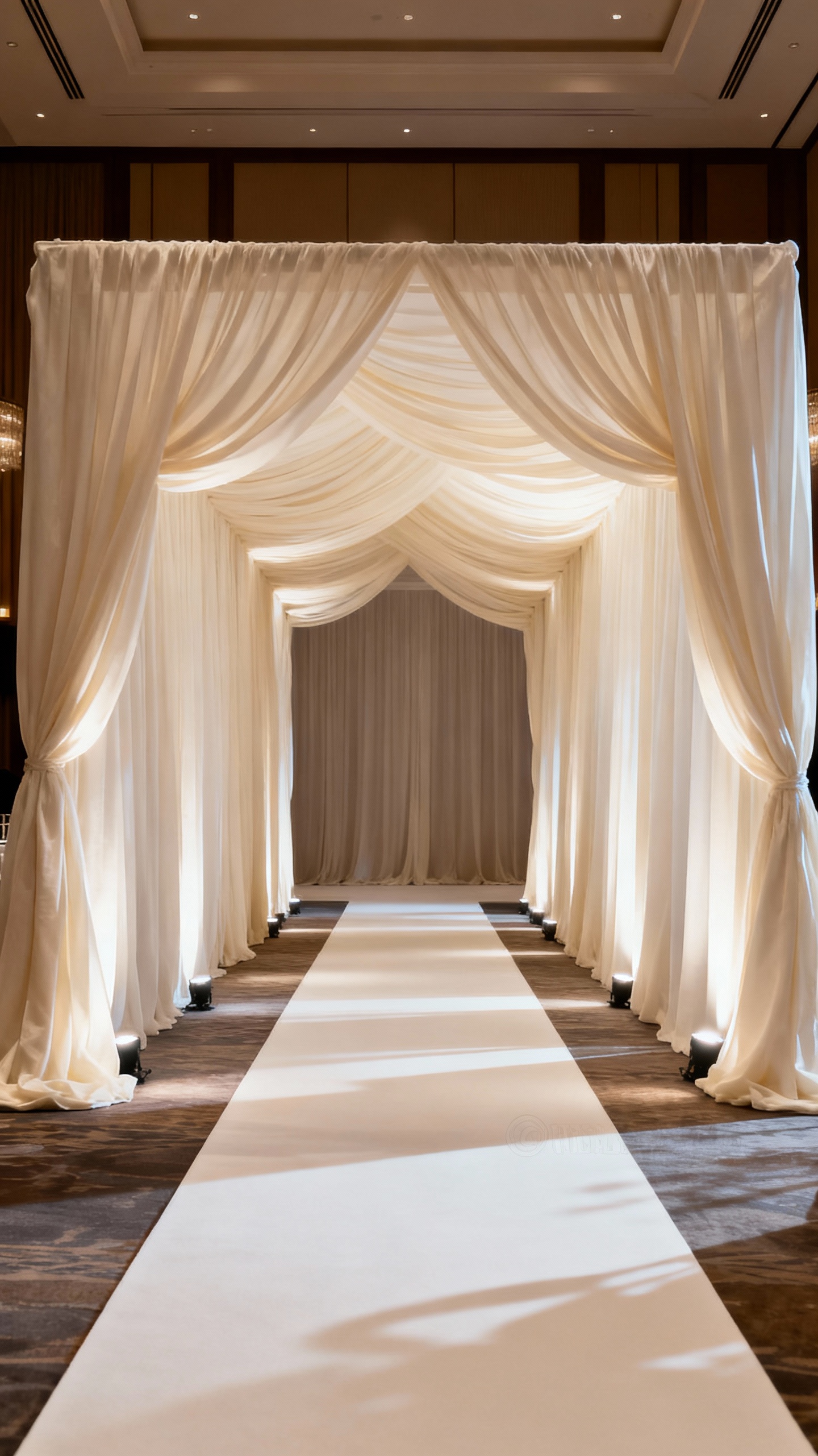 Draping instantly softens hard ballroom lines and makes the space feel custom-built for your wedding. Use fabric to frame the ceremony, conceal unattractive walls, or create a grand entrance tunnel that guests walk through. Bonus: ceiling draping plus uplighting can transform an average indoor venue into a high-end, editorial setting.