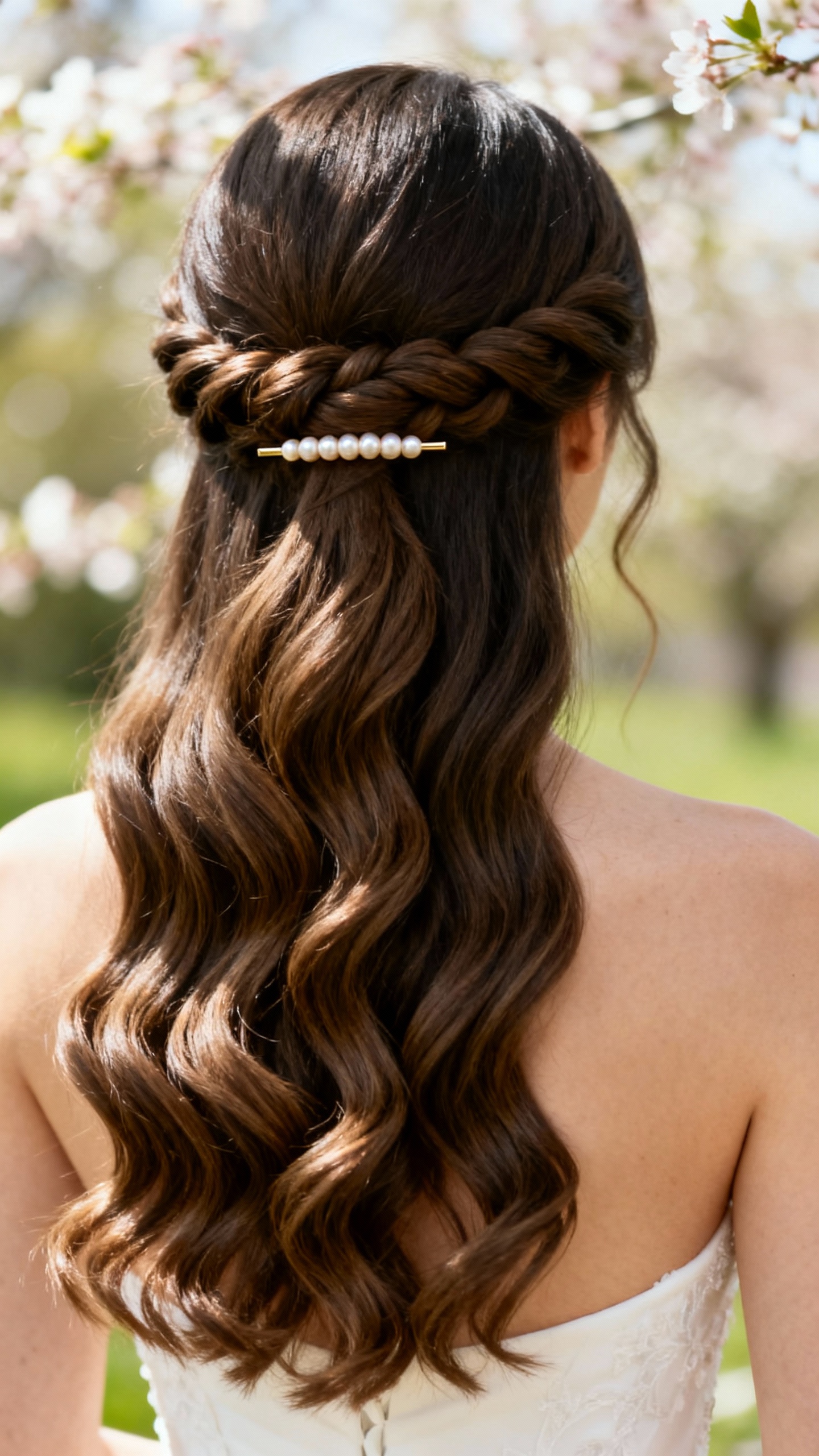 This one is for the bride who wants hair down energy, but still needs it to behave in May warmth. It flatters medium to long hair and looks especially pretty on round and heart face shapes because the half-up lift opens the face and adds height. The vibe is soft, youthful, and Pinterest-perfect—especially with pearls or a delicate barrette. Practical tip: use a curl-then-cool method (let curls fully cool before brushing out) and secure the half-up section with a hidden mini elastic plus pins under the clip for real hold, not just “cute for 10 minutes” hold.