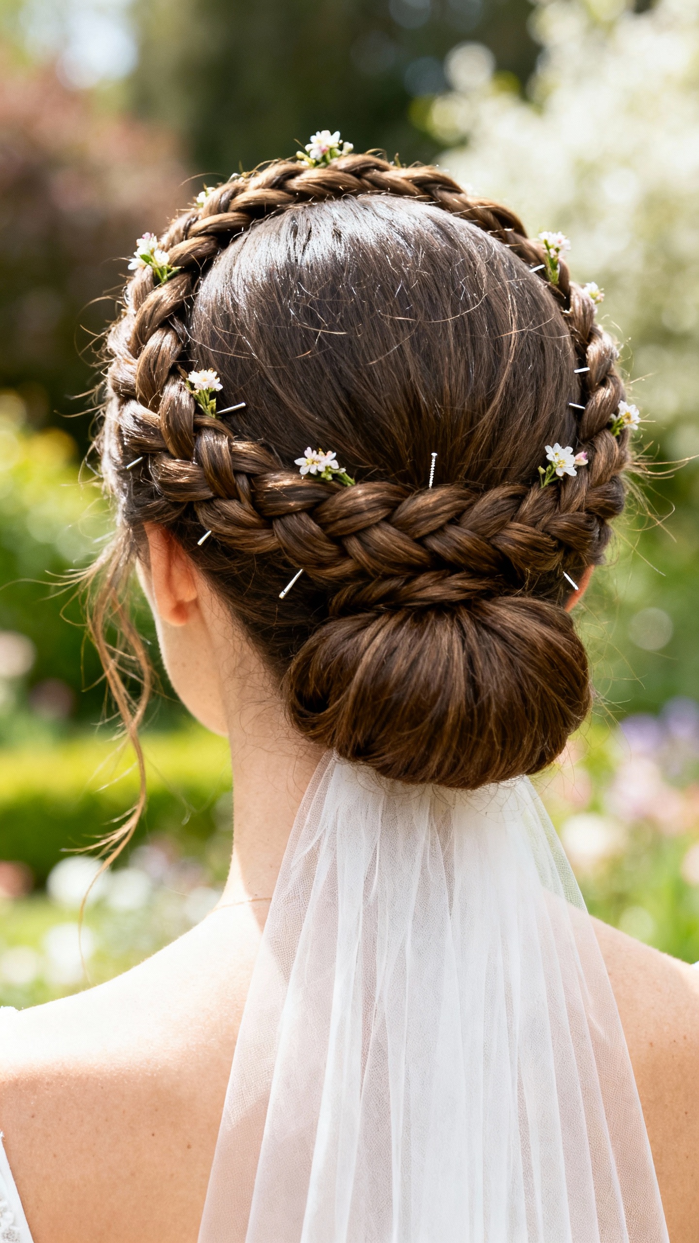 This style is basically “spring goddess” but practical: braids help grip the hair so everything stays secure in warmth and humidity. It flatters most face shapes and is especially stunning on thick hair, though fine hair can totally do it with a bit of prep. The vibe is whimsical, floral, and perfect for outdoor ceremonies. Practical tip: have your stylist prep with a volumizing mousse or grip powder before braiding, and tuck a few petite flowers or crystal pins along the braid while keeping the veil anchored at the low knot so it doesn’t tug or shift.