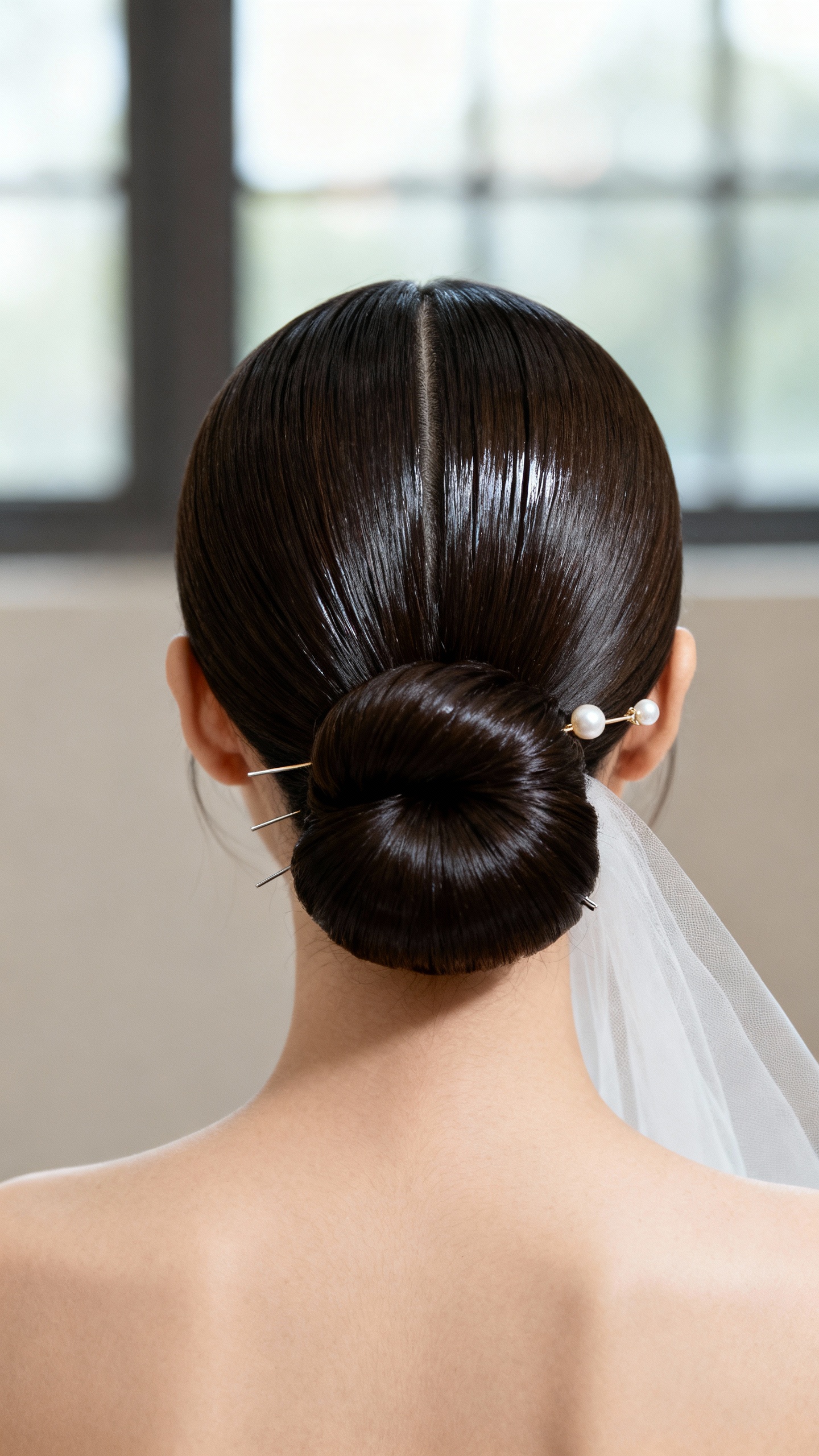 This is the ultimate warm-weather classic: clean, chic, and locked in. It flatters oval, heart, and round face shapes because the center part and low placement elongate and balances. The vibe is modern-meets-timeless (think minimalist dress, pearl studs, glowy skin). Practical tip: ask for a strong-hold gel at the part and nape plus a mist of humidity-resistant hairspray to keep flyaways down all day, and place your veil right above the bun for the smoothest drape.