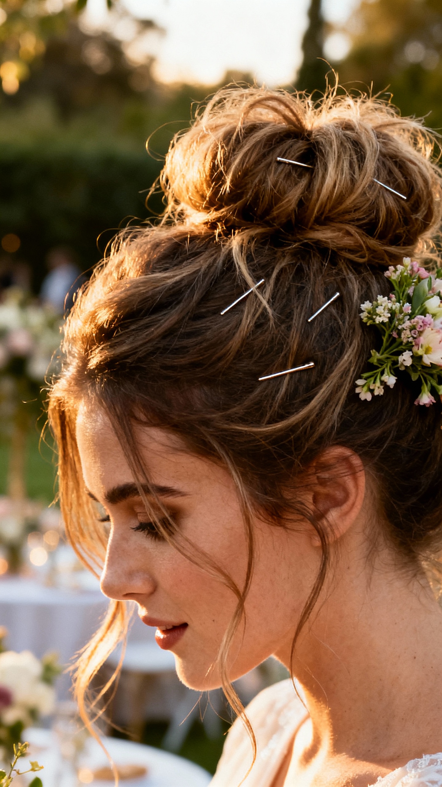 4) Textured Chignon with Fresh Flowers (or Floral-Inspired Clips)