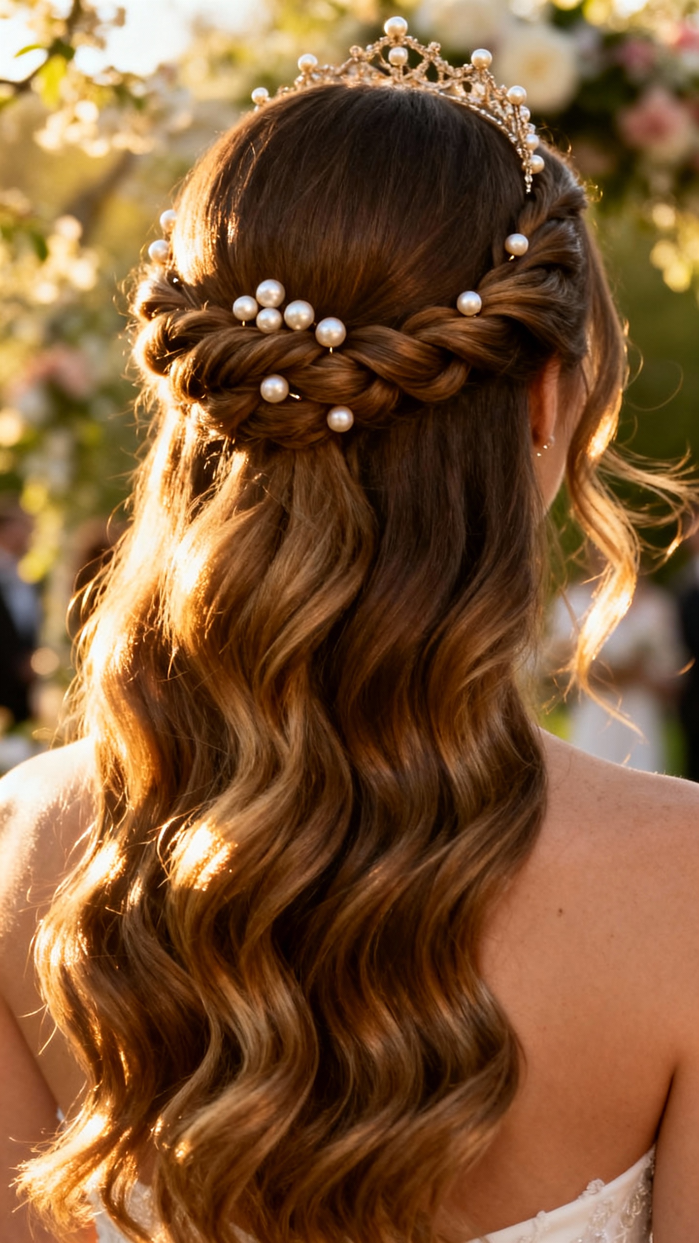 If you want your hair down but still controlled for an outdoor ceremony, this half-up moment is your best friend. It flatters most face shapes, especially square and diamond, because the twists soften angles while the waves add movement in photos. Practical tip: prep with heat protectant, then set curls with a medium-hold spray and let them cool fully before brushing out—cooling is what makes the style last. Pearl pins look cutest clustered near the twist for sparkle that catches golden hour light.