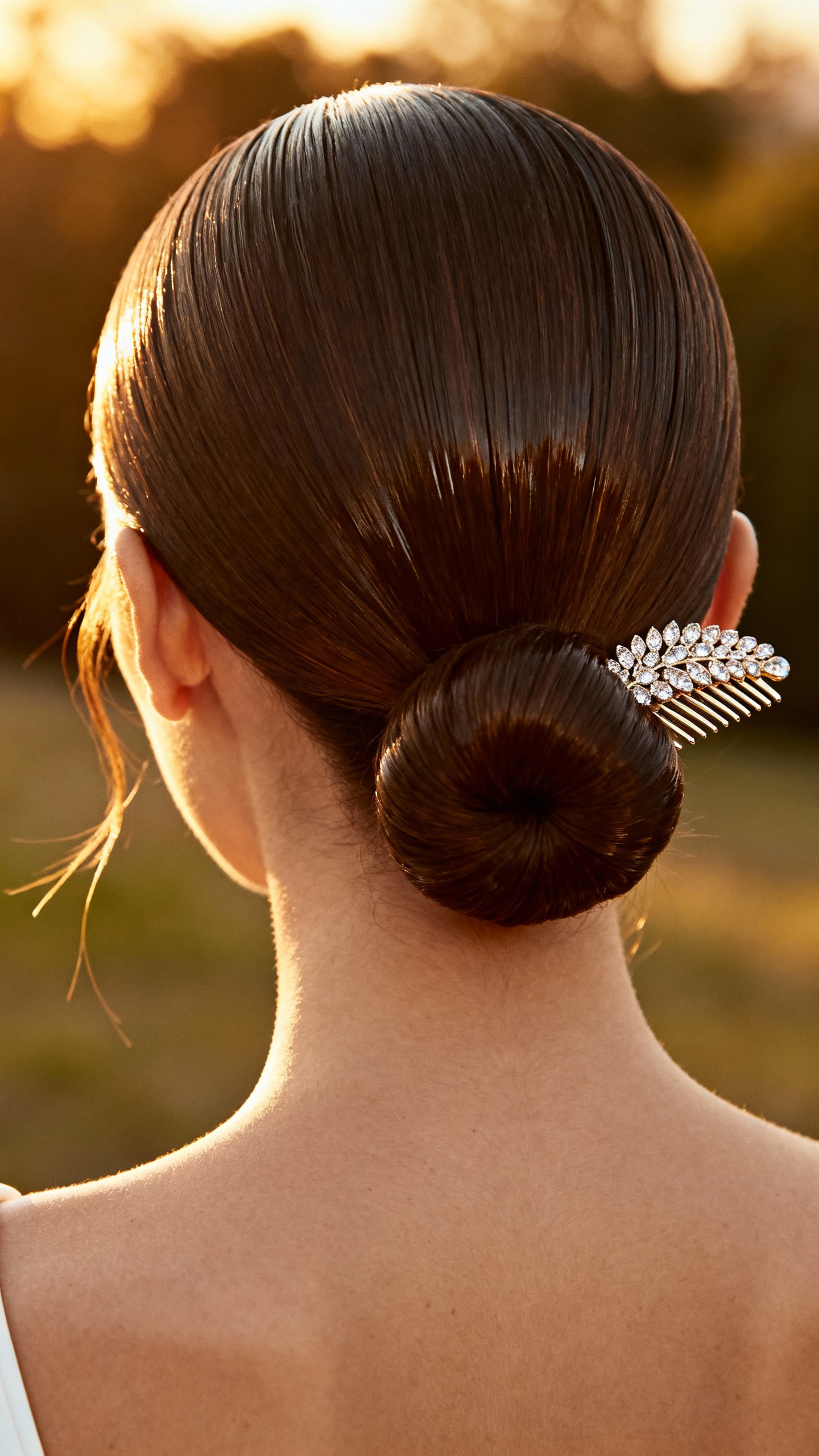 This one is for the bride who loves clean lines and modern elegance—sleek, snatched, and incredibly photo-friendly in golden hour. It flatters long and medium hair best, and it’s especially gorgeous on oval and long face shapes when paired with a middle or soft side part. Practical tip: use a humidity-resistant smoothing cream and finish with shine spray on a toothbrush (yes, really) to tame flyaways without over-spraying. A crystal or gold comb placed just above the knot gives instant “bridal” without needing extra volume.