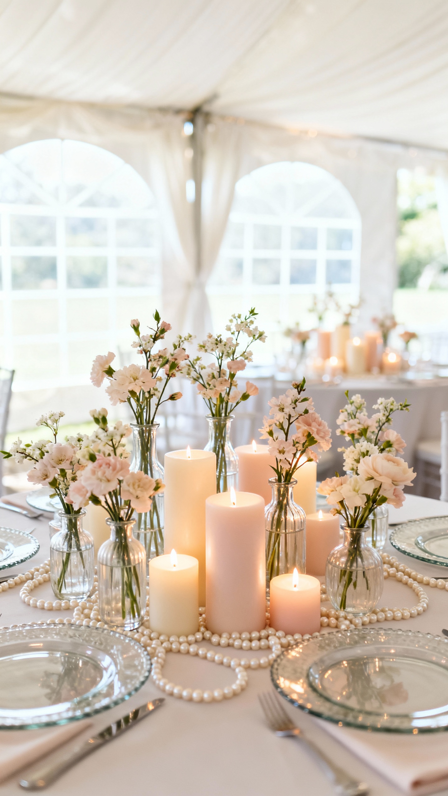 3) Light-Reflecting Tablescapes: Clear Glass, Pearls, and Candle Glow