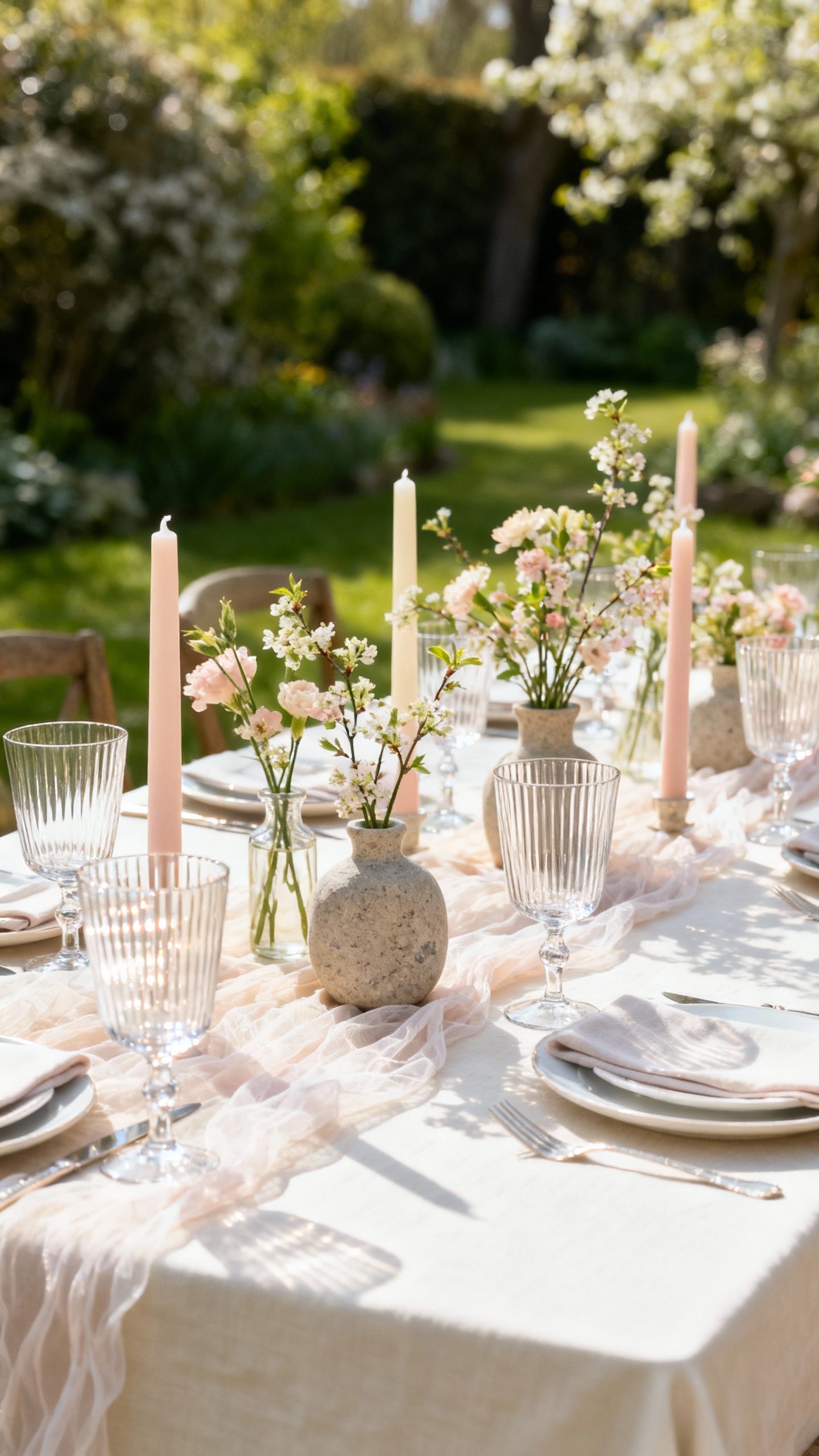 Focus on layered textures: linen, glass, ceramic, and a mix of bud vases plus candlelight. You can keep the palette simple while adding depth through materials, finishes, and intentional repetition of small details.