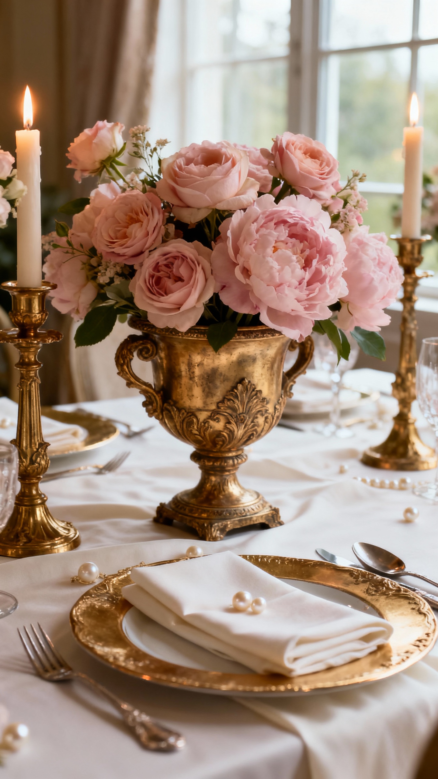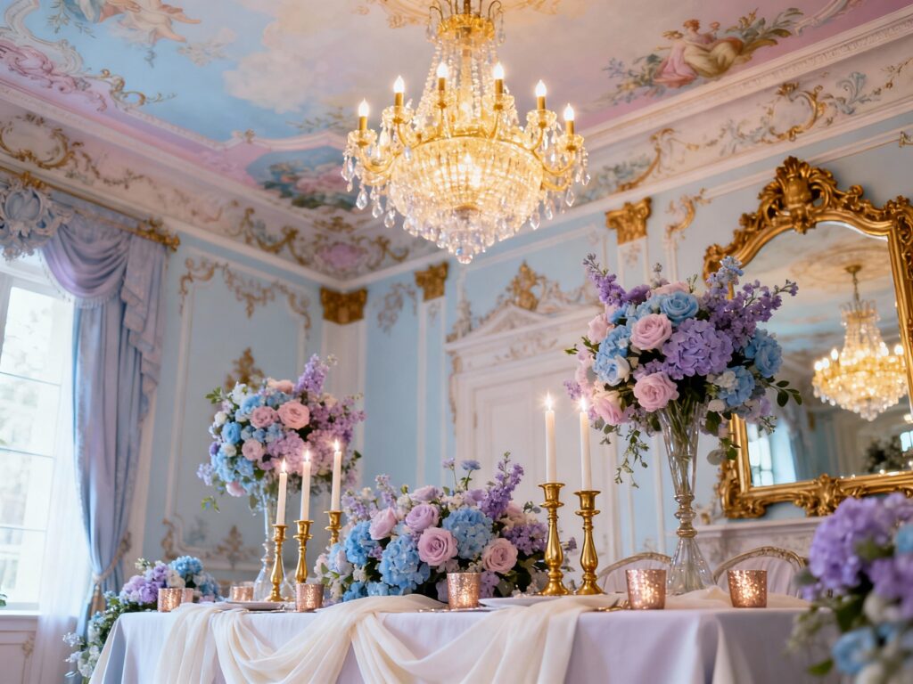 Pick one main pastel, one neutral, and one metallic, then repeat them consistently. Keep the “ornate” elements in accessories—frames, candlesticks, ribbon, and stationery—so the vibe feels intentional and refined. The goal is elegant detail, not clutter.