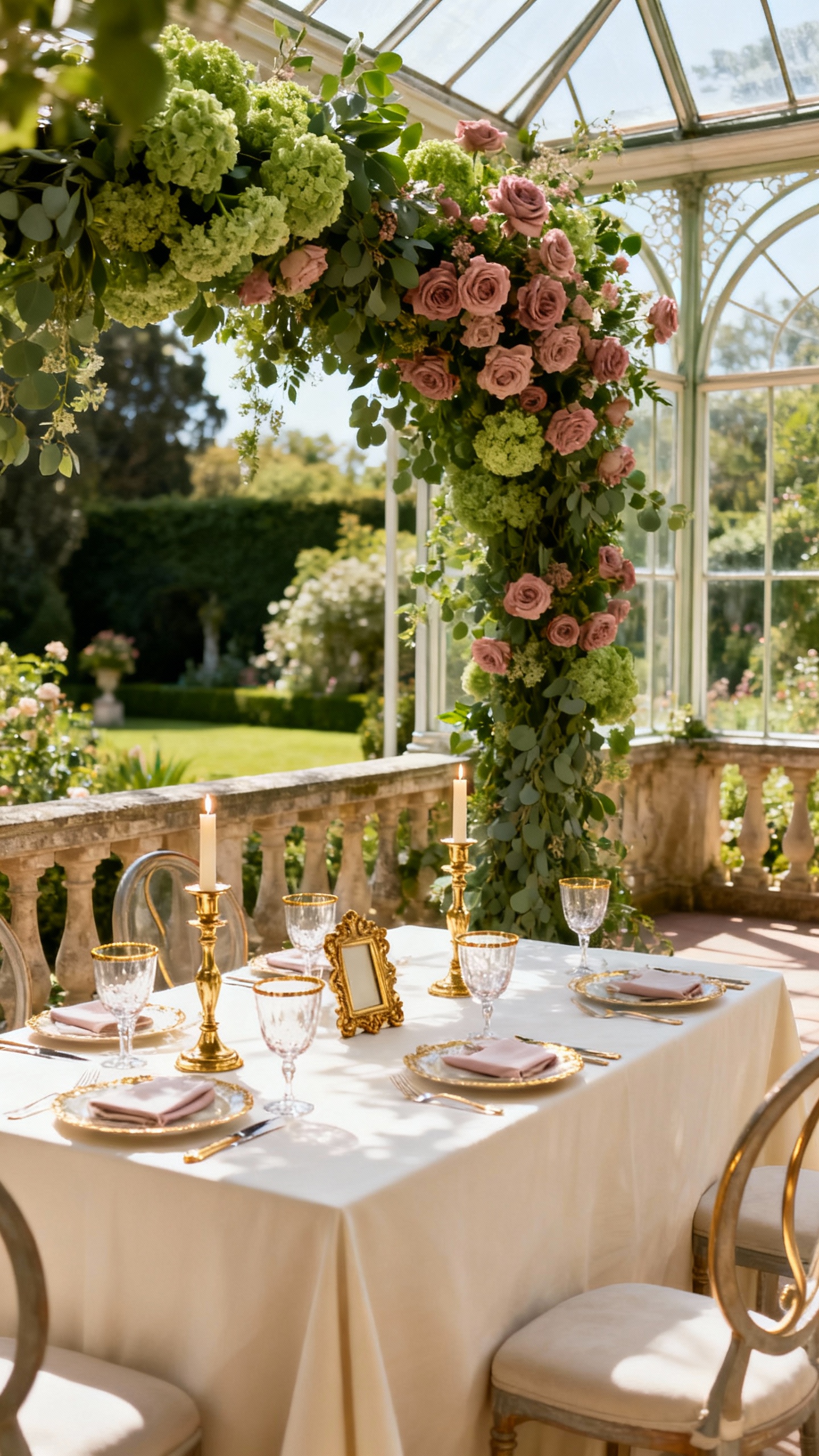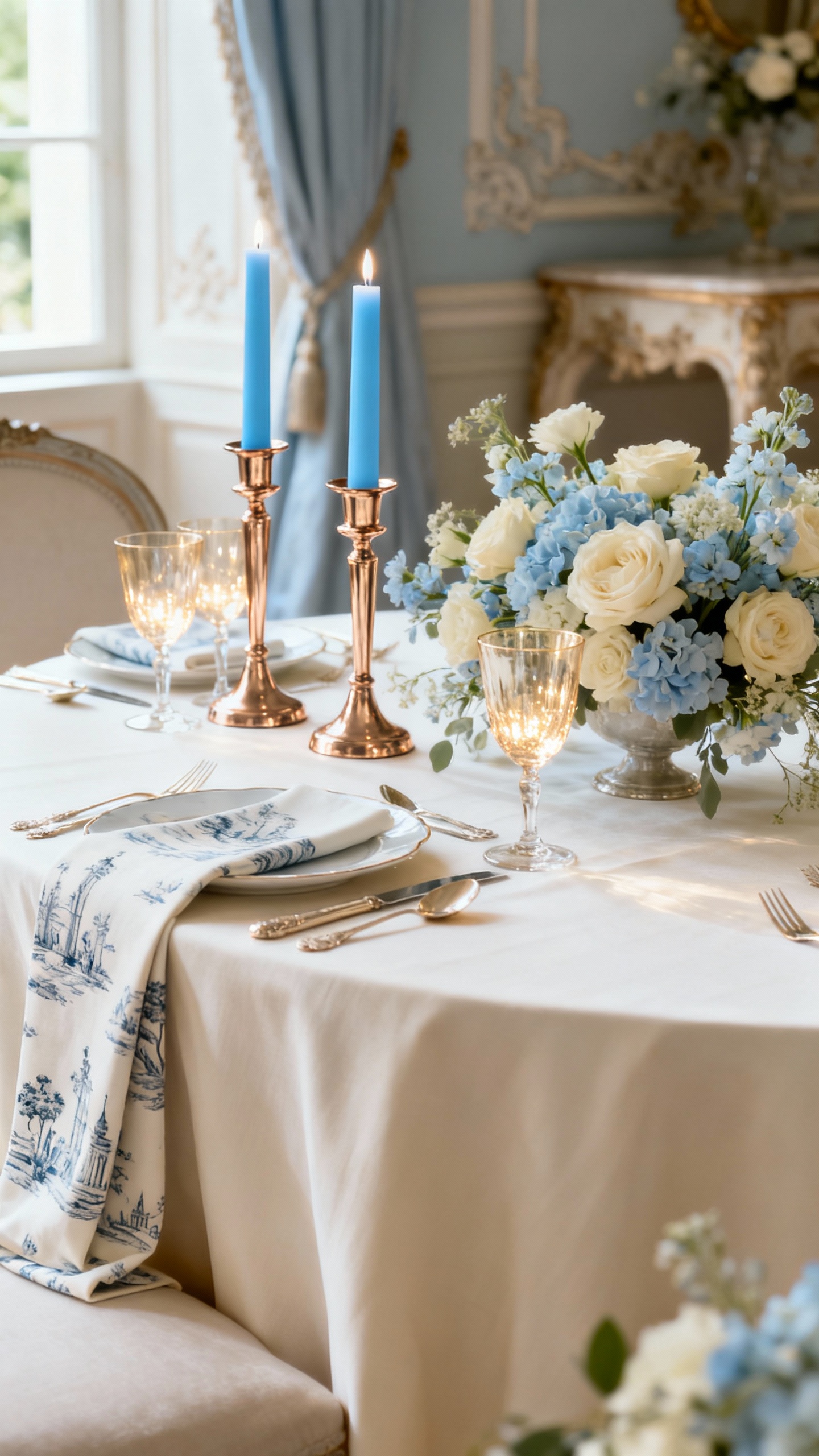 Powder blue instantly reads “French salon,” especially paired with creamy neutrals and warm champagne metallics. Try blue in taper candles, napkins, or a subtle toile pattern, then keep florals mostly cream with a few pale blue accents. Champagne works beautifully for chairs, cutlery, and lighting—soft sparkle, not harsh shine.