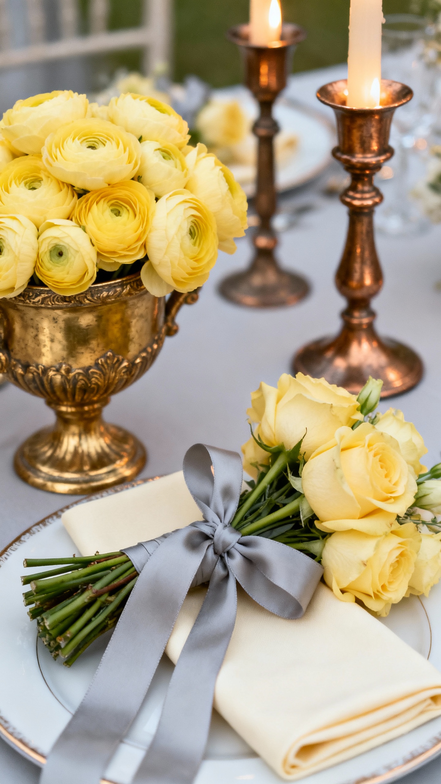 If you want Rococo but not “pink,” buttercream is your secret weapon: sunny, romantic, and totally timeless. Soft gray adds balance in suits, ribbons, or typography, while gilded bronze brings depth in vintage frames, tabletop accents, and candleholders. This palette is especially pretty for late-spring venues with natural light and stone architecture.