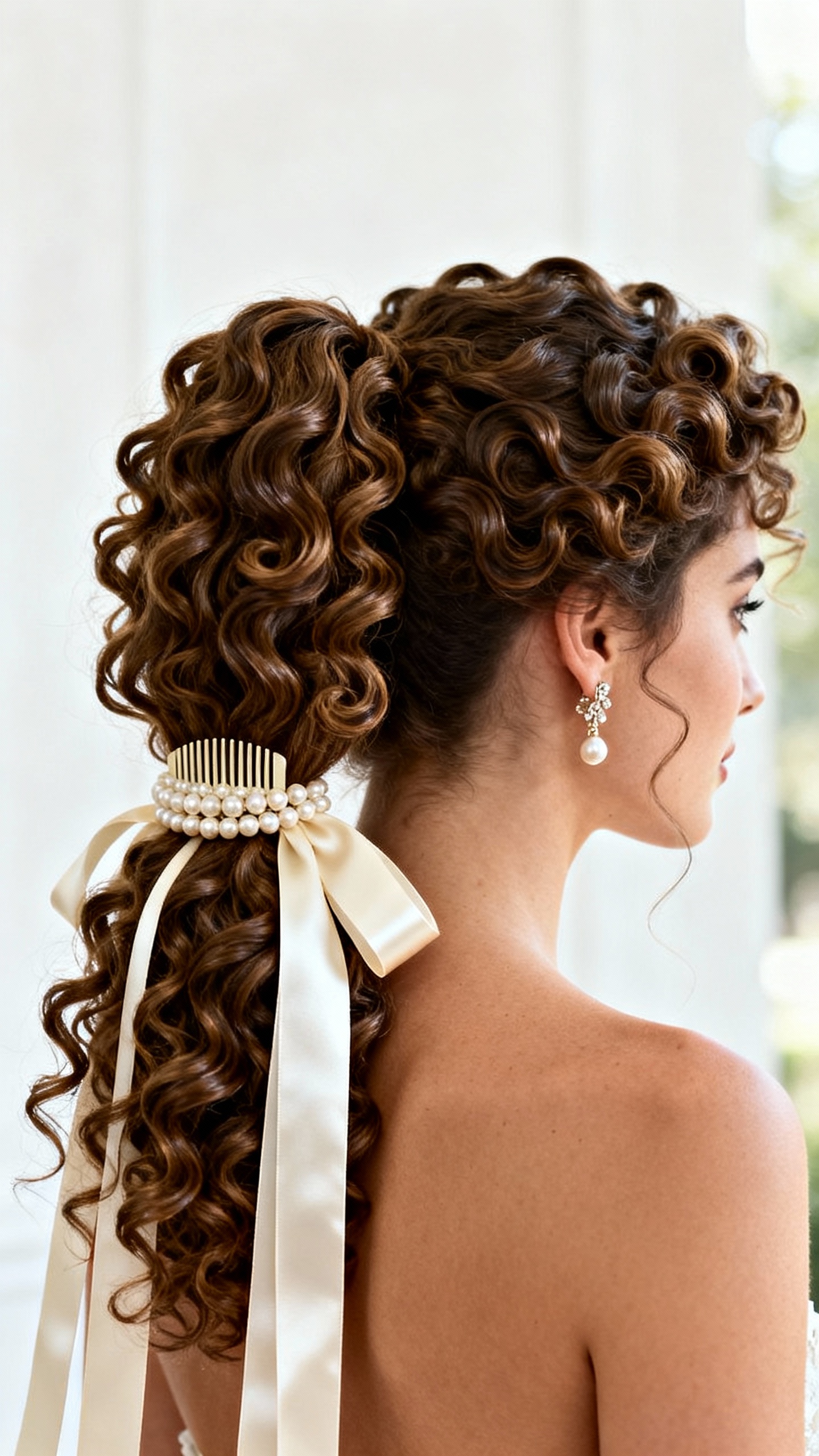 4) Rococo-Inspired Curly Pony with Pearl Comb + Trailing Ribbons