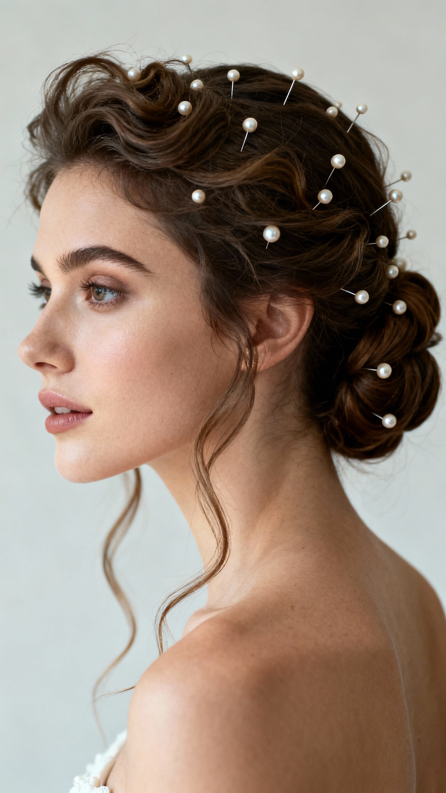 Use pearls that are attached to pins, wires, or combs (not loose beads). Ask your stylist to “lock” each piece with a crisscross bobby-pin base and a quick mist of flexible-hold hairspray. For extra security, place pearls where the hair is densest—around buns, braid seams, or the pony base.