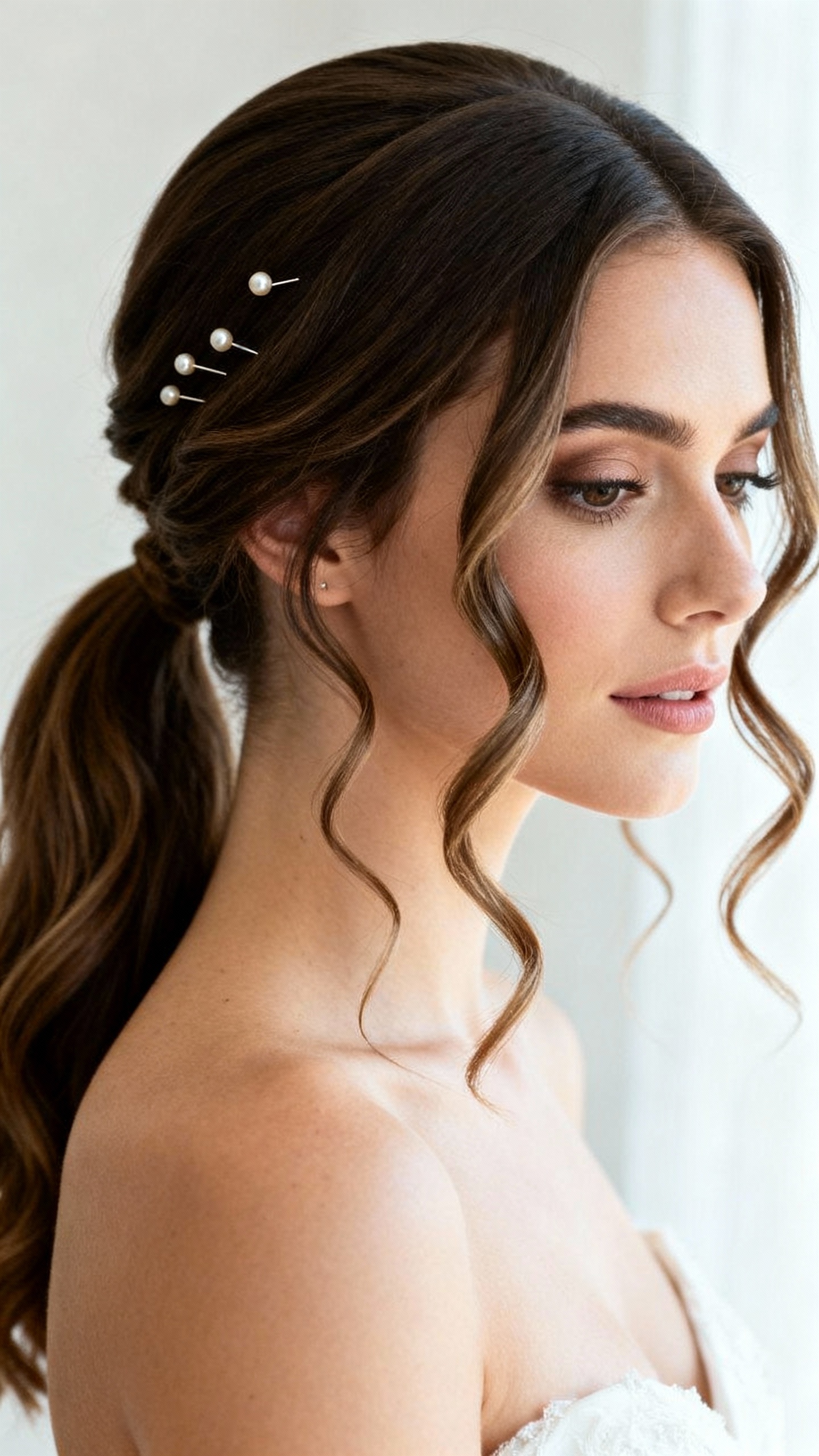 A low pony can be insanely bridal when it’s softly waved and paired with subtle accessories—think “rom-com lead” but elevated. It flatters round and heart-shaped faces because the tendrils create gentle vertical lines and the low placement keeps everything balanced. Practical tip: if you’re adding pearl pins, place them slightly above the pony base (not right on it) so they’re visible in photos and don’t get lost behind your hair or snag on a sweater/coat.