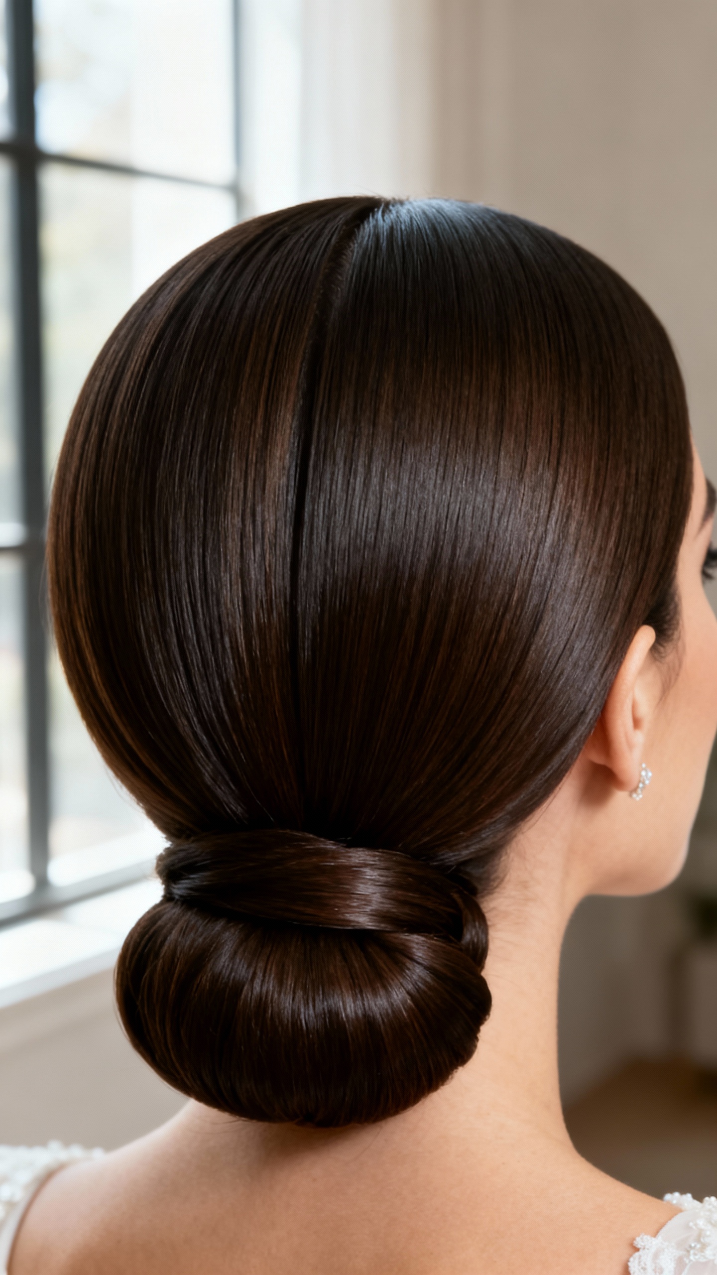 This look photographs insanely clean because everything is intentional: smooth roots, sculpted bun, and a crisp part that frames the face. It flatters oval, heart, and round face shapes (the low placement elongates) and gives chic “editorial romance” energy. Practical tip: use a strong-hold gel at the hairline, then finish with a shine spray on a toothbrush to tap down flyaways without making the bun crunchy.