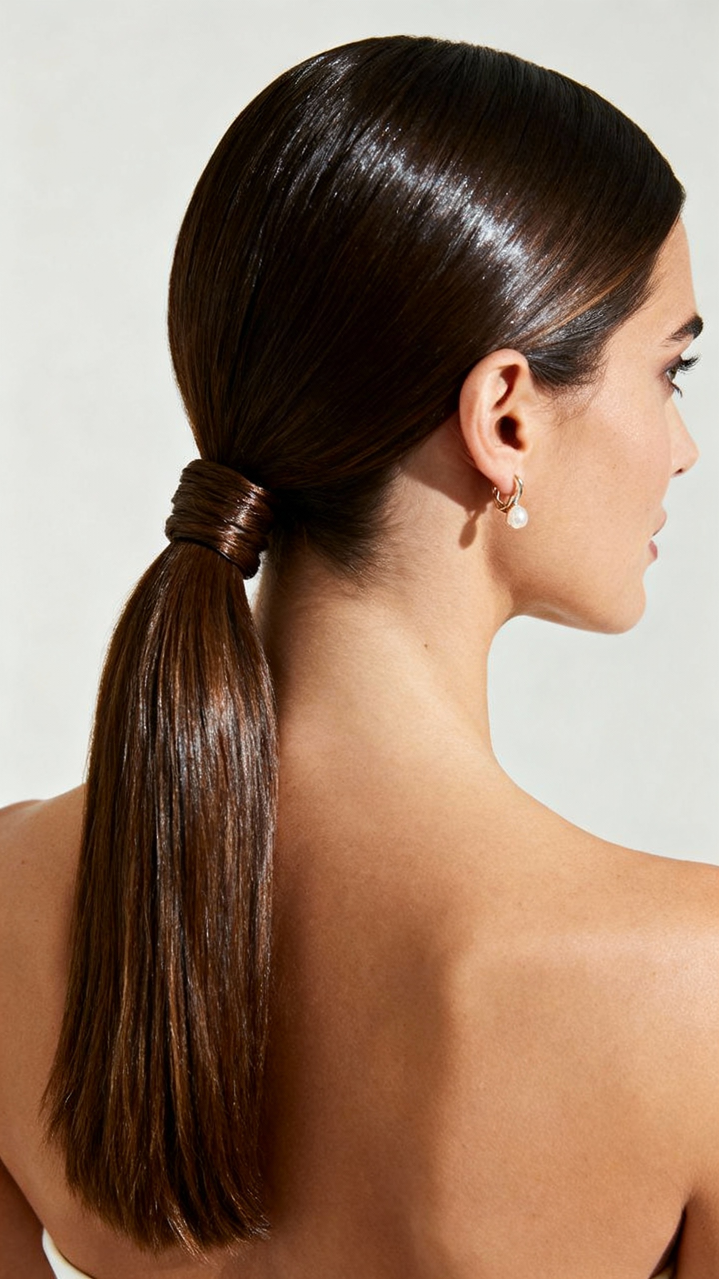 4) Glossy “Old Money” Ponytail with Wrapped Base