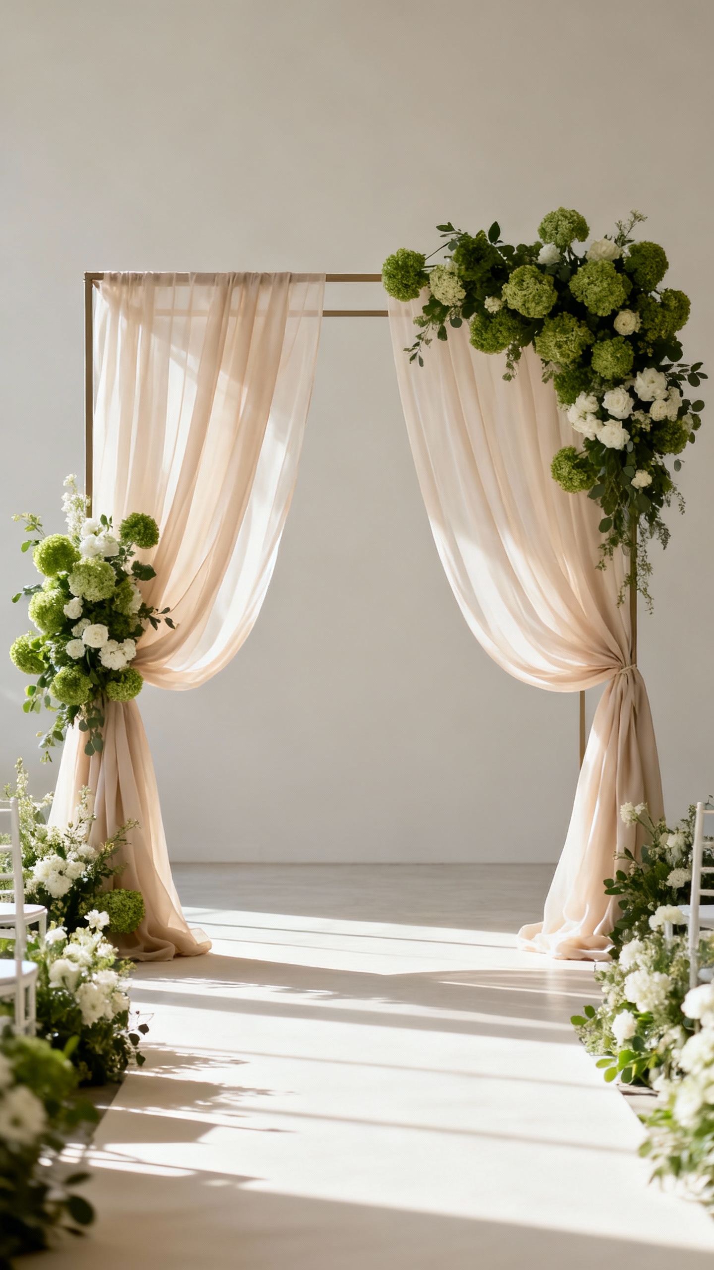 Draped fabric is the budget-friendly way to get that romantic, luxury look without renting a full floral arch. Use two to three panels of chiffon or voile in a soft neutral, then add a few clusters of greenery (or bud vases tied on with ribbon) for dimension. It photographs beautifully, covers awkward walls, and instantly frames your ceremony like it’s a styled shoot.