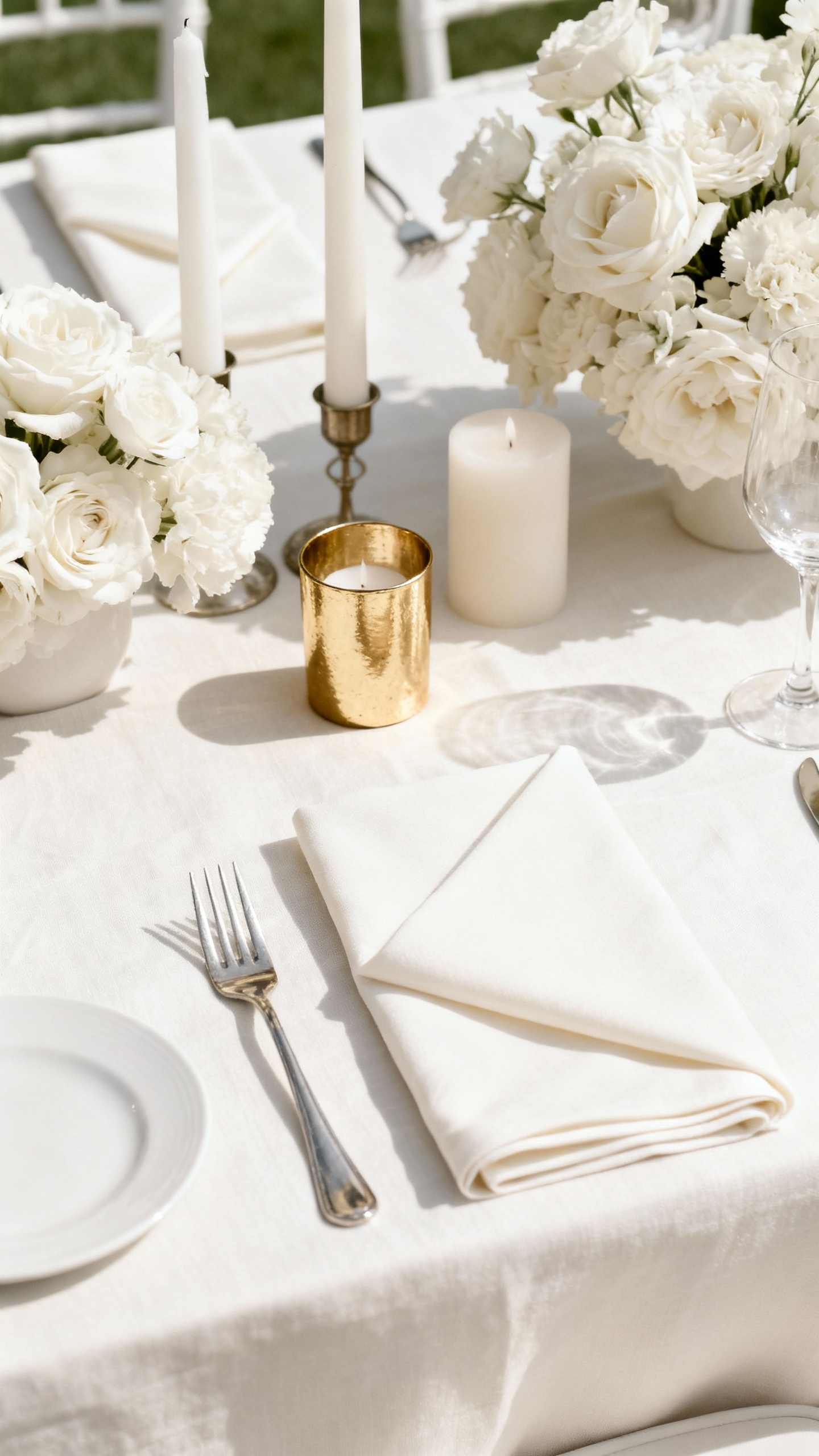 Candles, draping fabric, and bud vases win every time. Candlelight adds instant romance, fabric hides “plain” spaces, and bud vases create that layered tablescape look without needing tons of flowers. They also photograph beautifully in close-ups and wide shots.