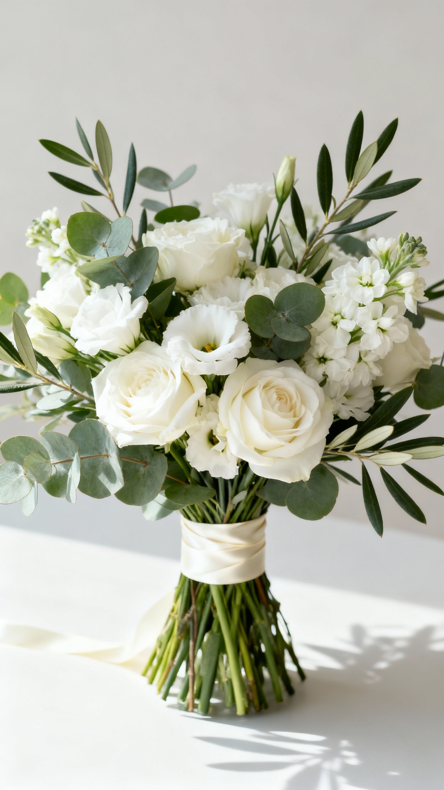 This is the clean-girl of wedding florals: crisp whites plus layered greenery for texture. Use white roses or garden roses with lisianthus, then add eucalyptus, Italian ruscus, or olive branches for movement. It photographs beautifully in any venue and feels instantly polished without needing a million blooms. Ask for varied greens so it looks intentional, not “leftover filler.”