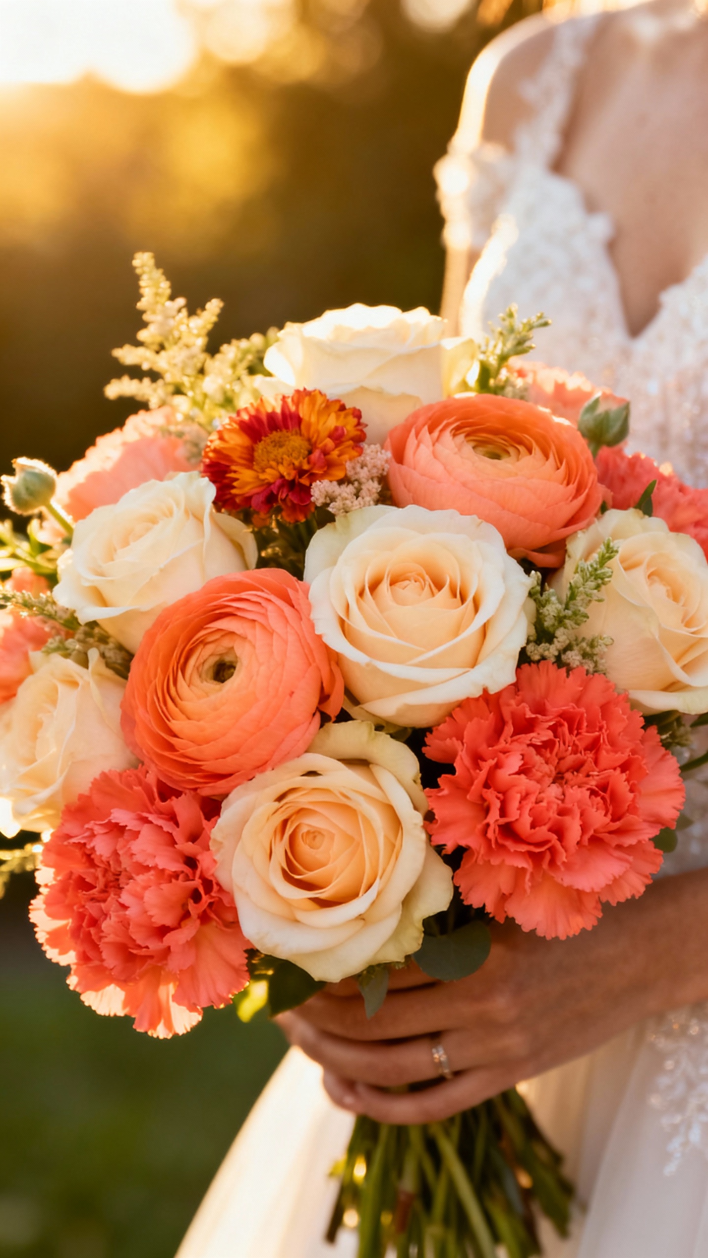 If you want cheerful without going neon, peach/coral/cream is your sweet spot. Think cream roses, peach ranunculus, and coral carnations (yes, carnations can be chic when used intentionally). Add a pop of apricot stock or tulips for height and softness. This palette is perfect for garden venues and summer weddings, and it gives skin tones a warm glow in photos.