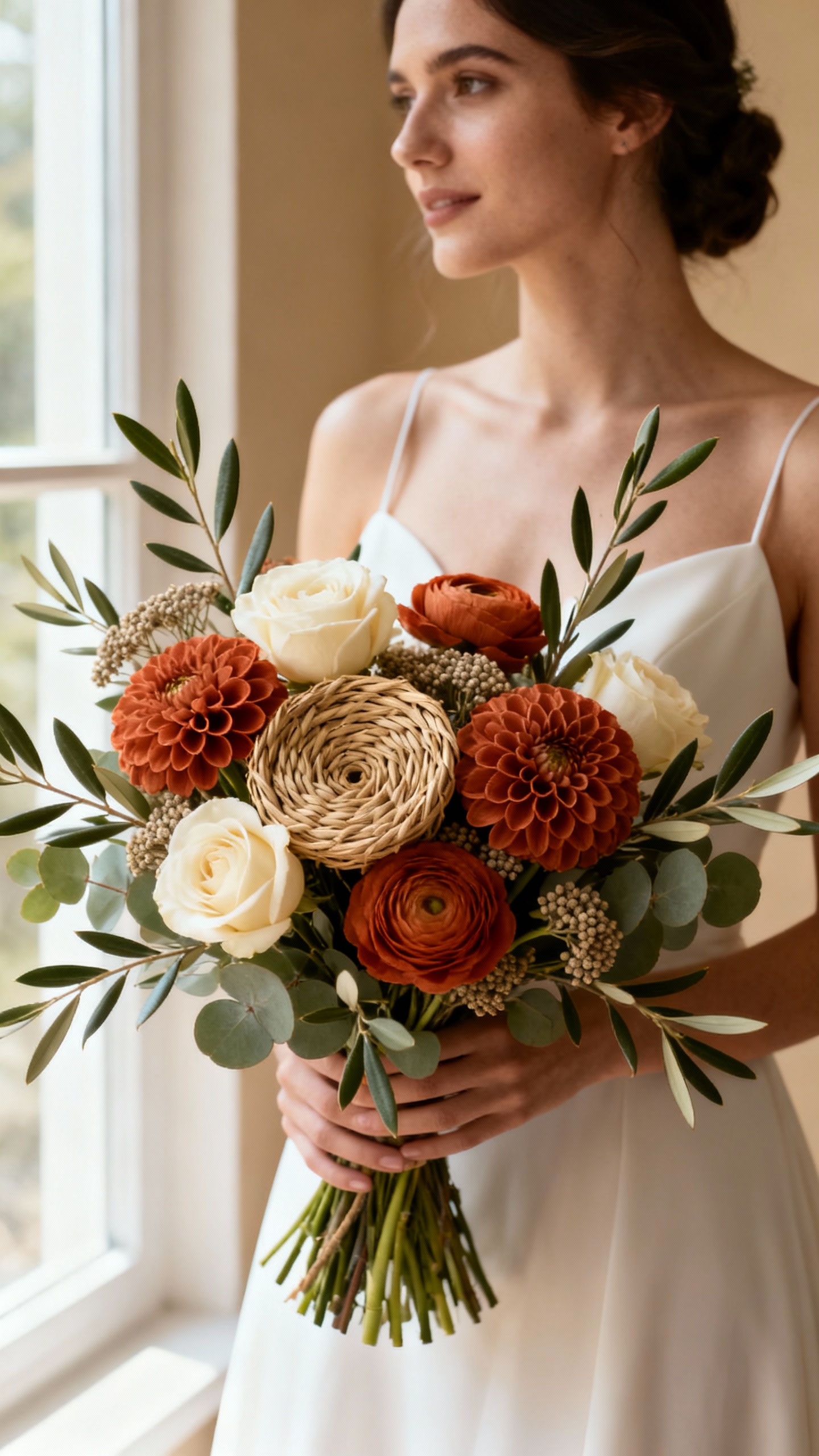 Terracotta is still having a moment because it looks luxe and grounded at the same time. Combine cream roses with terracotta-toned dahlias, ranunculus, or roses, then weave in olive branches or seeded eucalyptus for an organic shape. Keep the palette tight (no bright reds) so it reads elevated, not fall festival. Bonus: it pairs beautifully with candles, wood tables, and neutral bridesmaid dresses.
