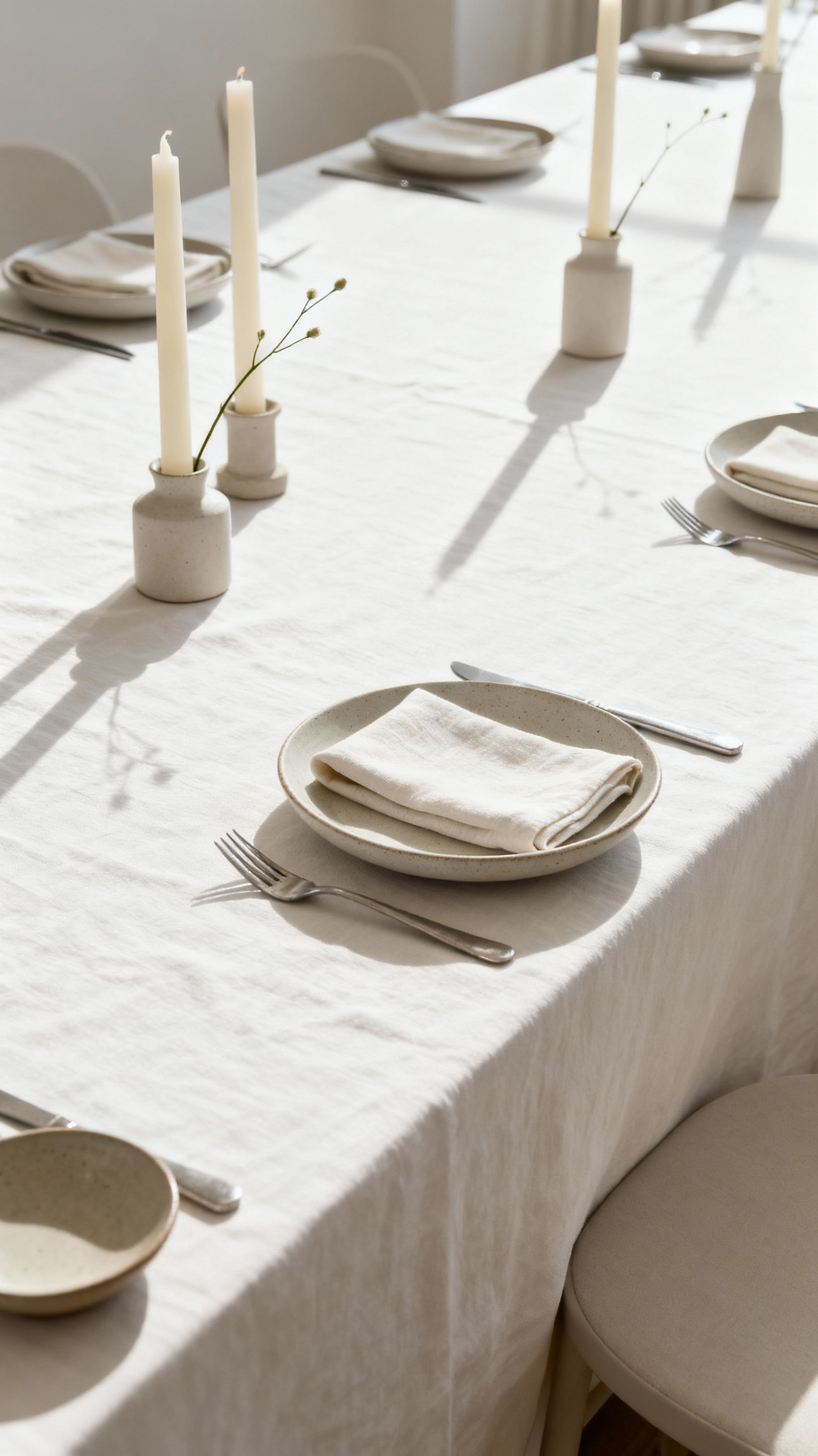 Editorial tables aren’t crowded; they’re curated. Choose a few strong elements—like tapered candles, simple bud vases, and a linen napkin—and let negative space do the work. When your table has breathing room, details photograph crisp, and guests still have space to actually eat and talk.