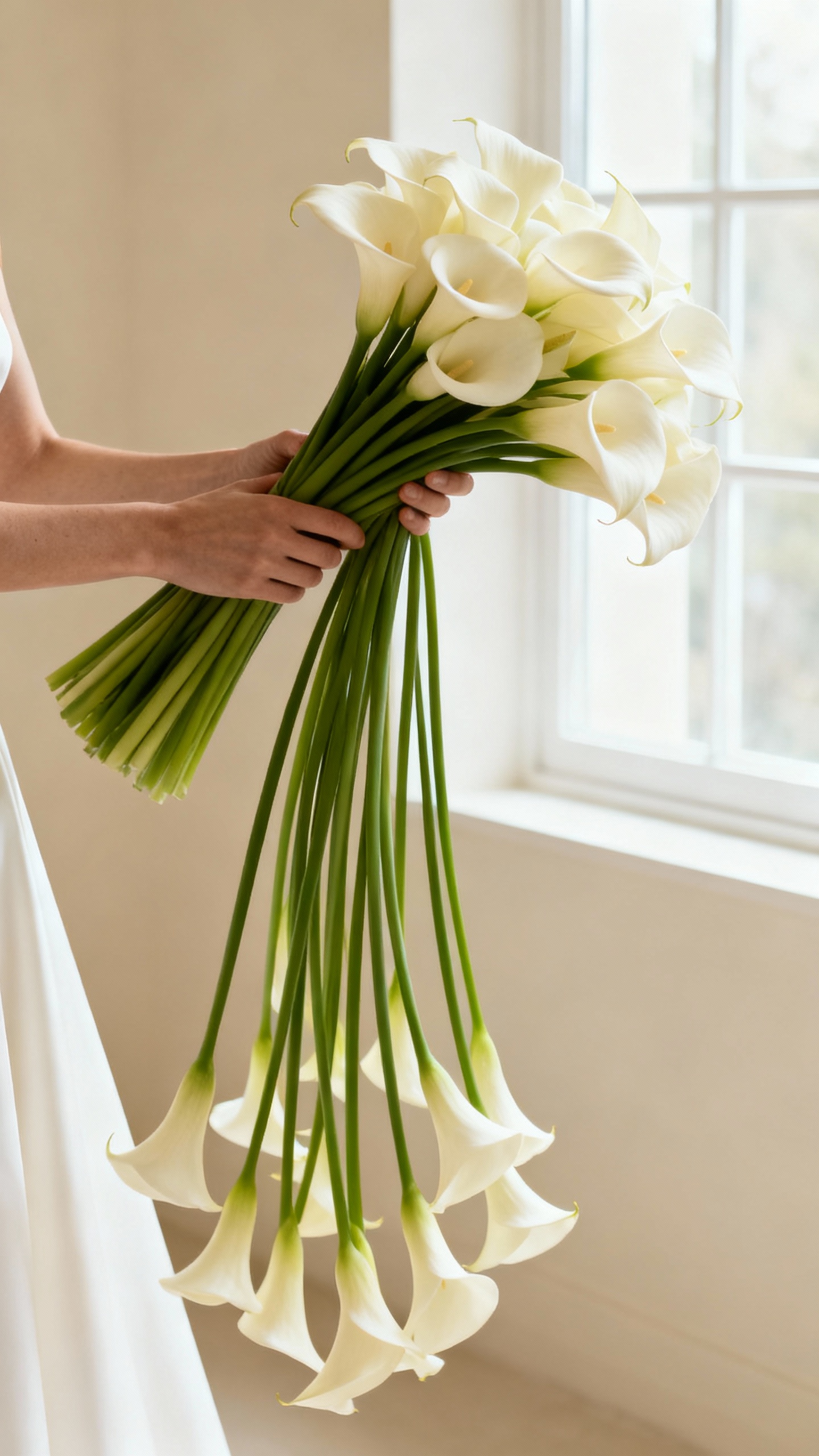 Calla lilies are basically the “model-off-duty” of wedding flowers: sleek, sculptural, and instantly chic. Go for a hand-tied bunch of long-stem white or ivory callas and let the stems extend for that runway feel. Keep the wrap minimal (think ivory silk ribbon) and ask your florist to align the blooms so they face slightly different directions for dimension.