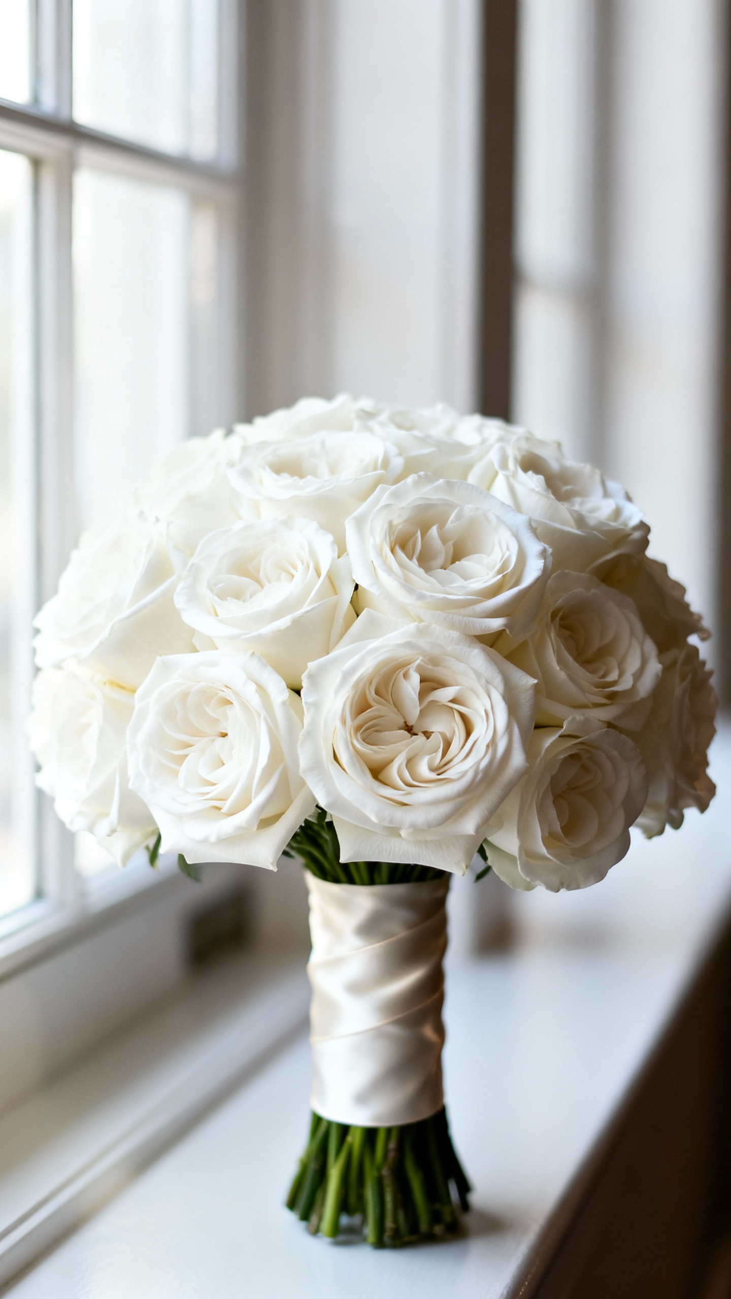 A bouquet made of only roses feels timeless, but the “editorial” upgrade comes from choosing a statement variety like garden roses or reflexed roses. Keep the palette monochrome (ivory, blush, or deep red) and go for a rounded, slightly looser shape. It’s also a great option if you want a romantic look that won’t compete with detailed dress lace or a dramatic veil.
