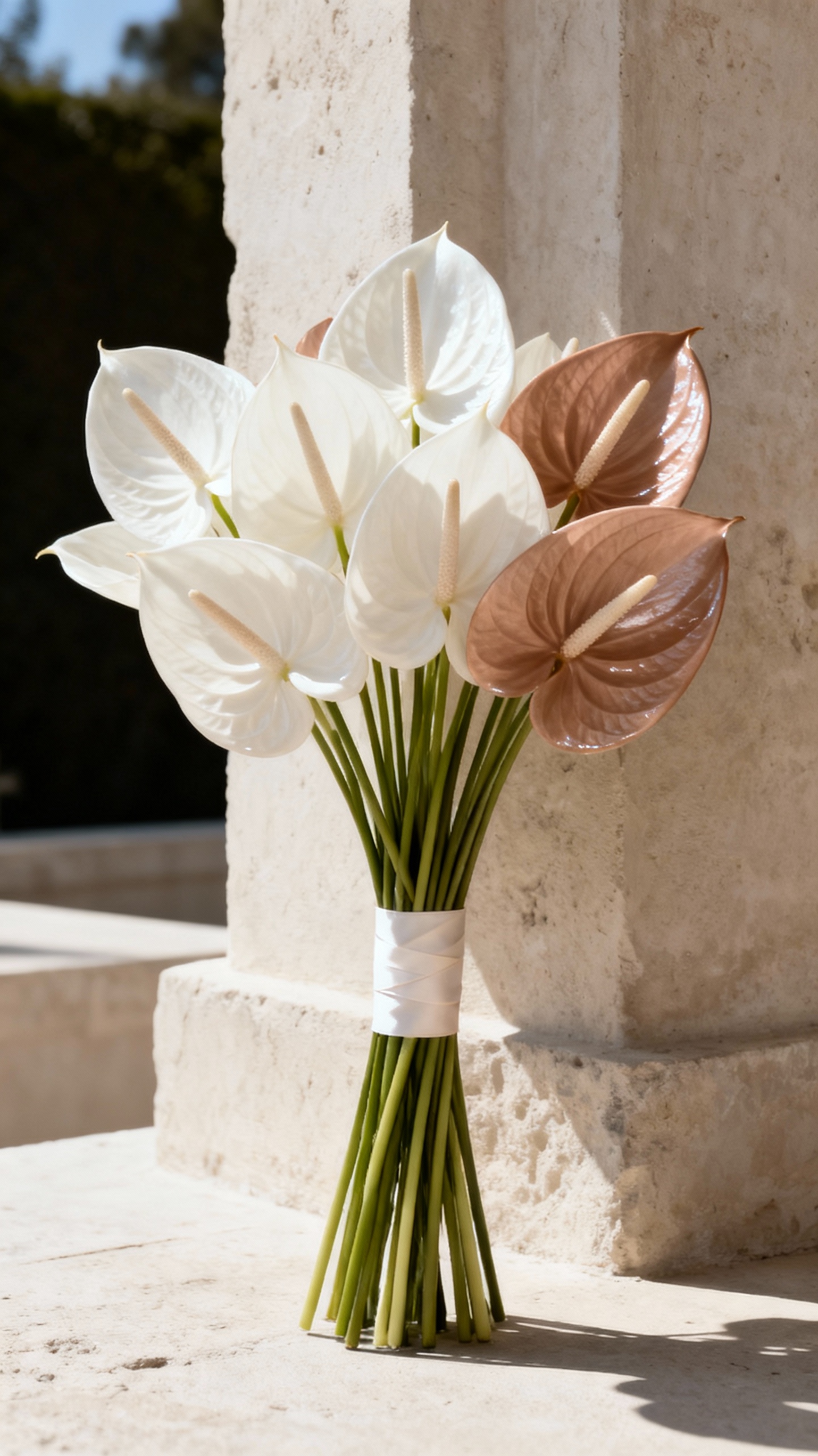 Anthuriums give that glossy, architectural look that screams runway—especially in white, soft pink, or mocha tones. Choose 5–9 stems and let the natural shape do the work; the key is negative space and a slightly asymmetrical silhouette. This bouquet looks insanely good against sleek satin dresses and modern gallery-style venues.