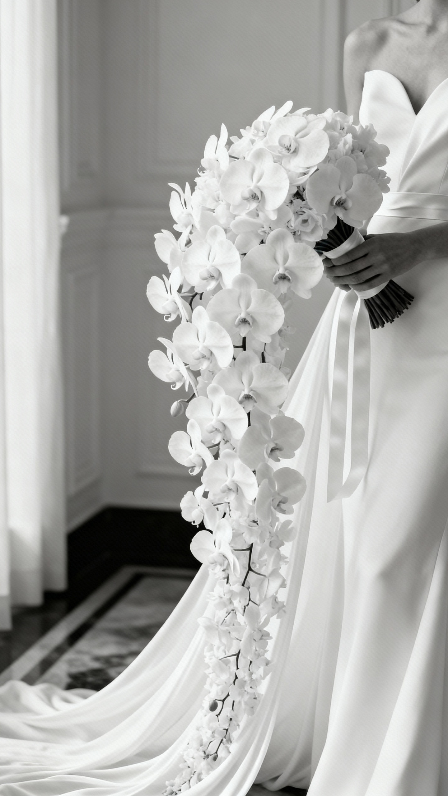 All-orchid bouquets feel instantly elevated, especially with cascading phalaenopsis orchids for that fashion-editorial drape. Keep it monochrome (white on white is iconic) and let the bouquet be the statement—minimal jewelry and clean hair styling look amazing with this. It’s perfect for destination weddings, rooftop ceremonies, or any bride who wants “wow” without a ton of different flowers.
