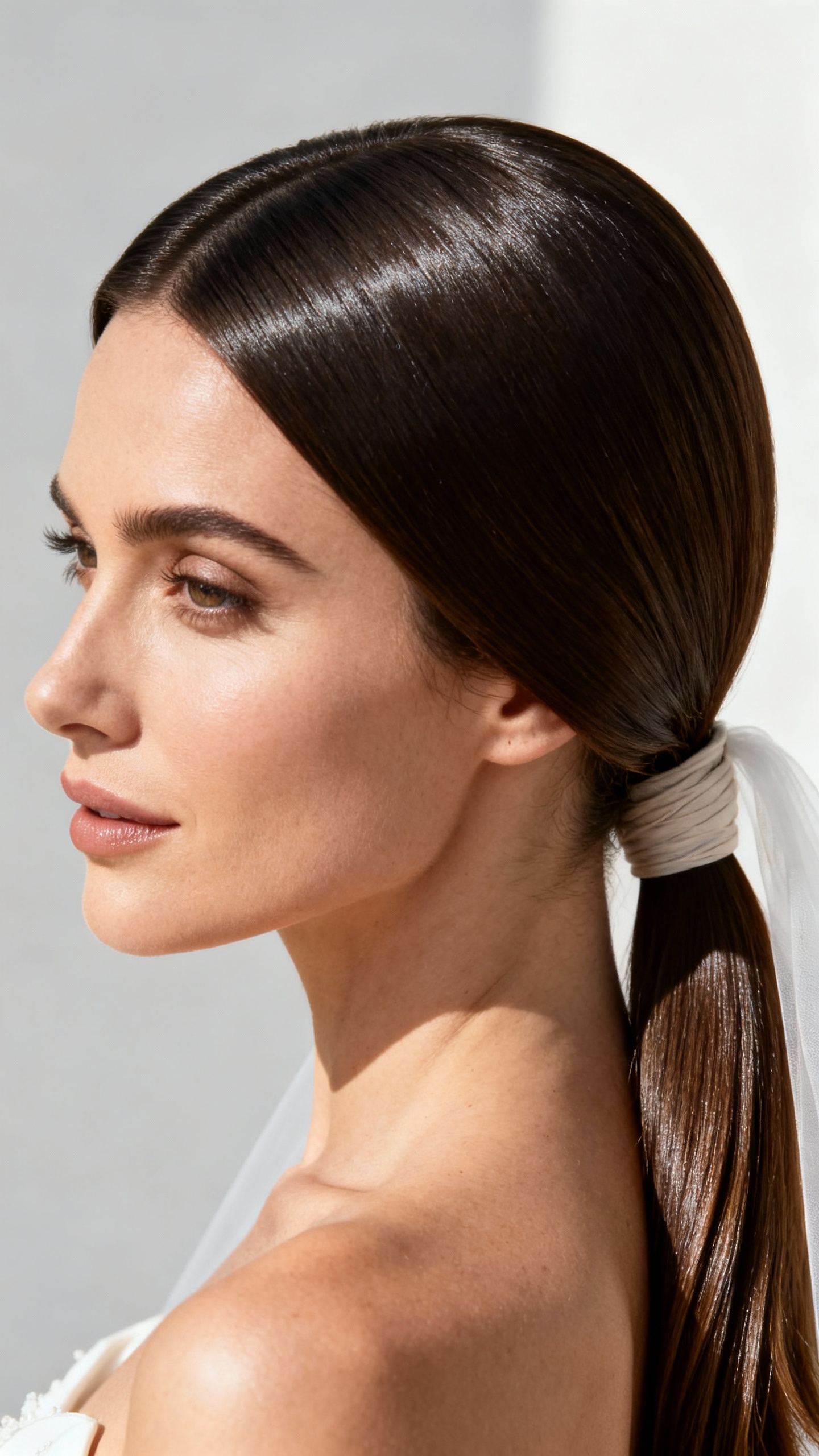 This one is for the bride who wants sleek and fashion-forward, but still wedding-appropriate. It flatters long necks and looks amazing with high or square necklines, plus it works beautifully on medium to long hair (extensions welcome). For hold and shine, prep with a smoothing cream, then wrap a small section of hair around the elastic and pin underneath—bonus points if you tuck the veil above the ponytail for a clean silhouette.