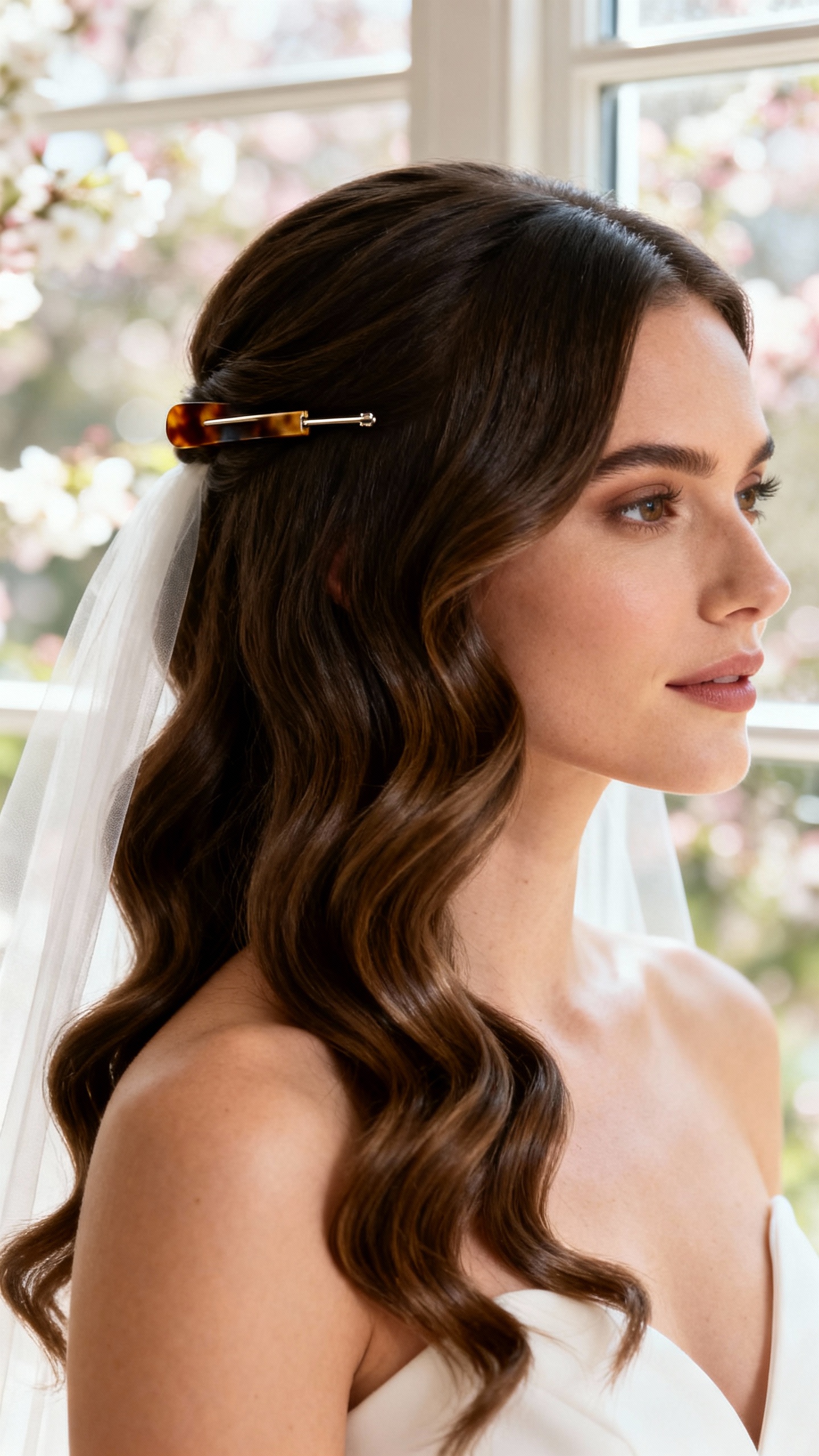 Half-up waves give you the best of both worlds: lifted, photo-ready structure in front with soft movement in back. It flatters pretty much everyone, but it’s especially great if you want to highlight your cheekbones while still wearing your hair down. Keep it quiet-luxury by choosing a slim pearl or gold barrette (not overly sparkly), and curl the ends in one direction for a smoother, more expensive-looking wave pattern.