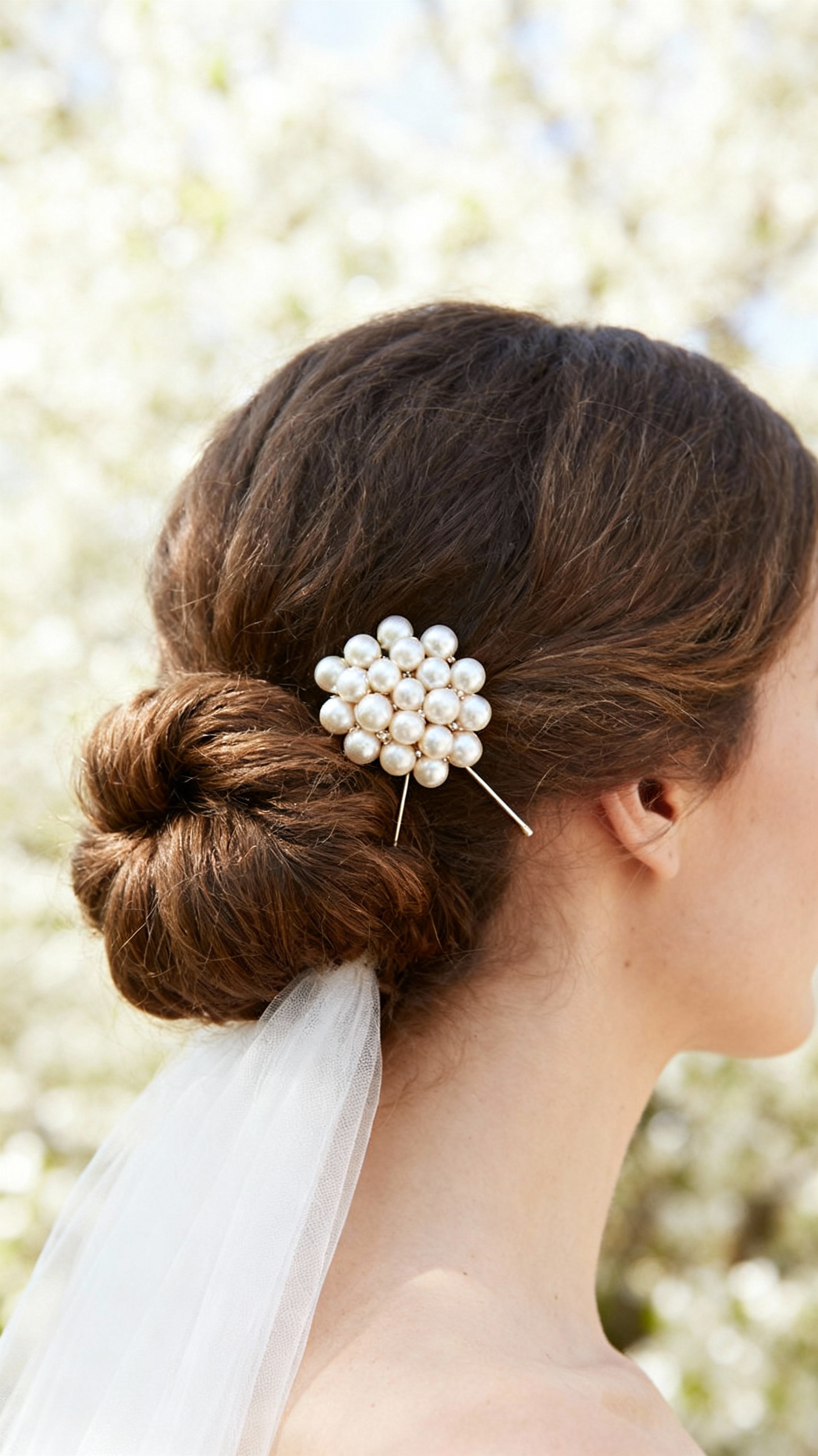 Think refined and minimal: slim pearl pins, a delicate gold comb, a satin bow in a neutral tone, or a single crystal barrette with a clean shape. Avoid anything too large or overly glittery if you want that understated, editorial feel.