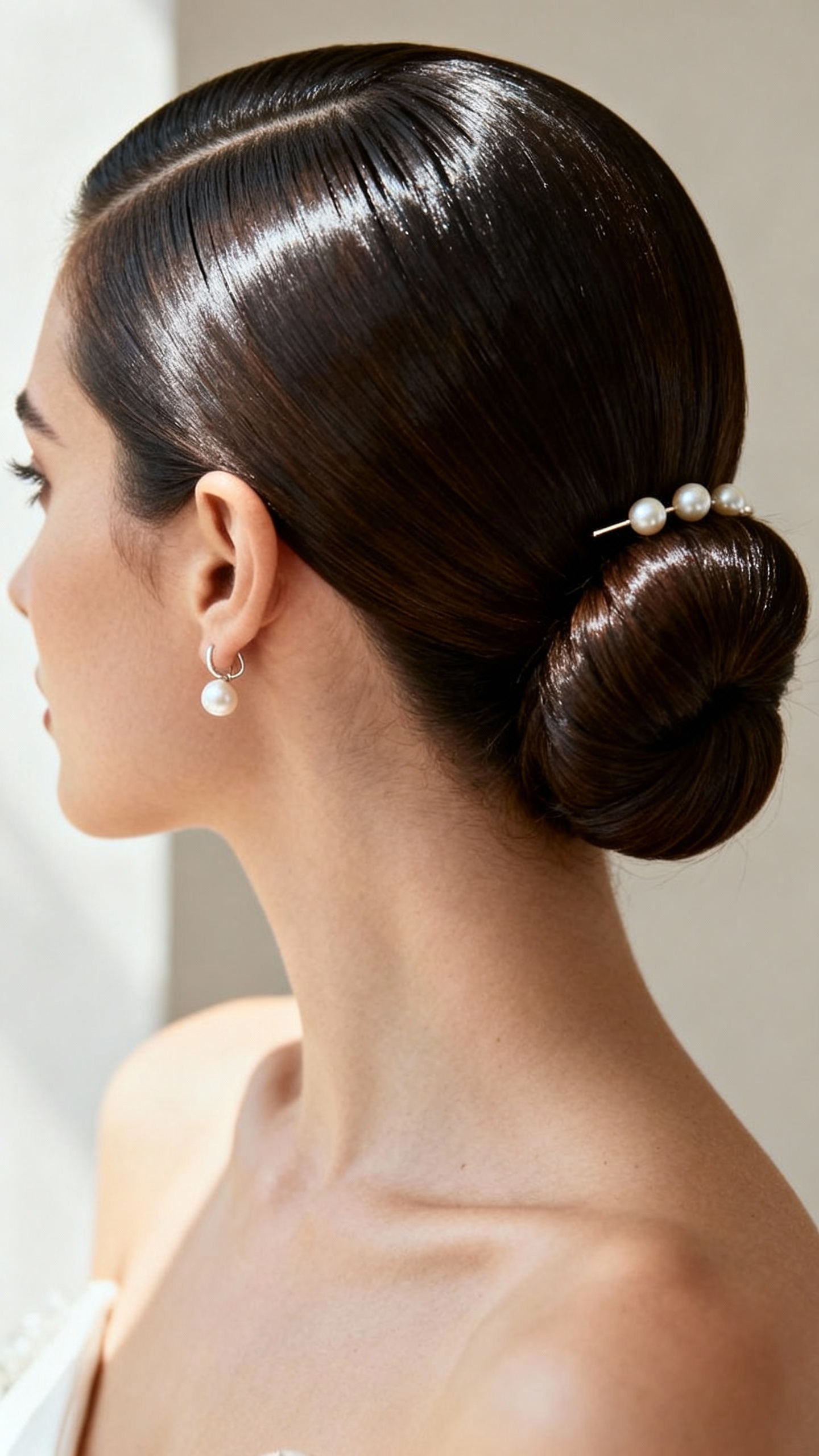 If you want sleek but slightly more “editorial,” a sculpted chignon with a deep side part brings instant sophistication. It’s especially flattering on angular or long face shapes because the side part adds softness and dimension without losing clean lines. Pro tip: keep the chignon tight and smooth, then add a single pearl pin or slim barrette directly above the ear on the heavier side for a balanced, intentional finish.