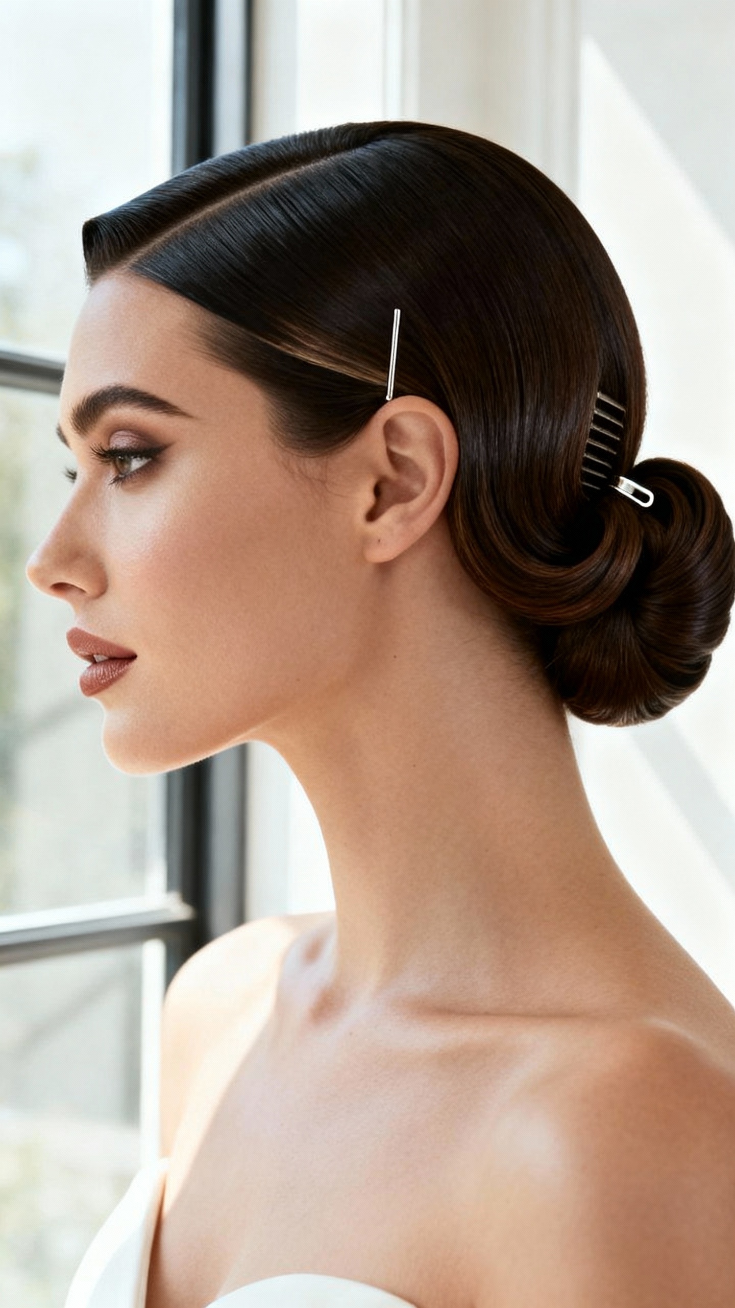 Think clean and architectural: slim barrettes, pearl pins (used sparingly), minimalist combs, or a satin bow with crisp edges. If your dress is detailed, keep accessories smaller and let the sleekness be the statement. If your dress is simple, one bold piece—like a structured barrette—can elevate the whole look.