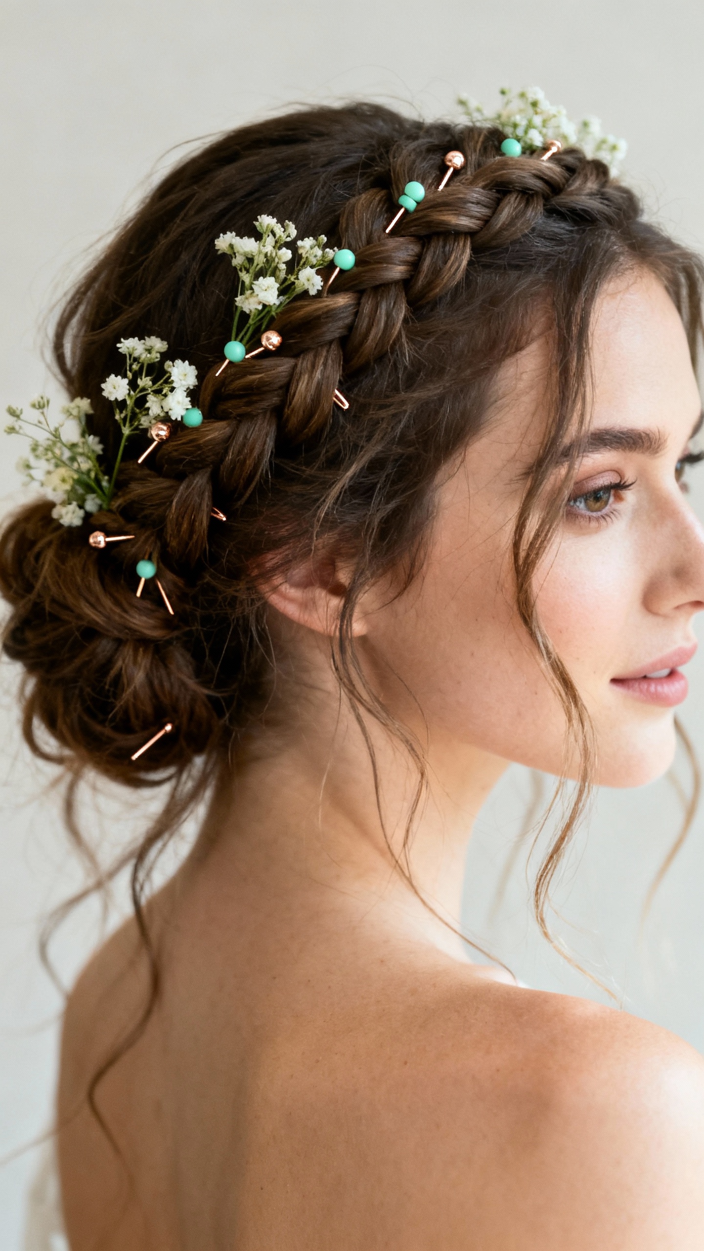 5) Mint + Champagne: Loose Braided Updos with Baby’s Breath Pins