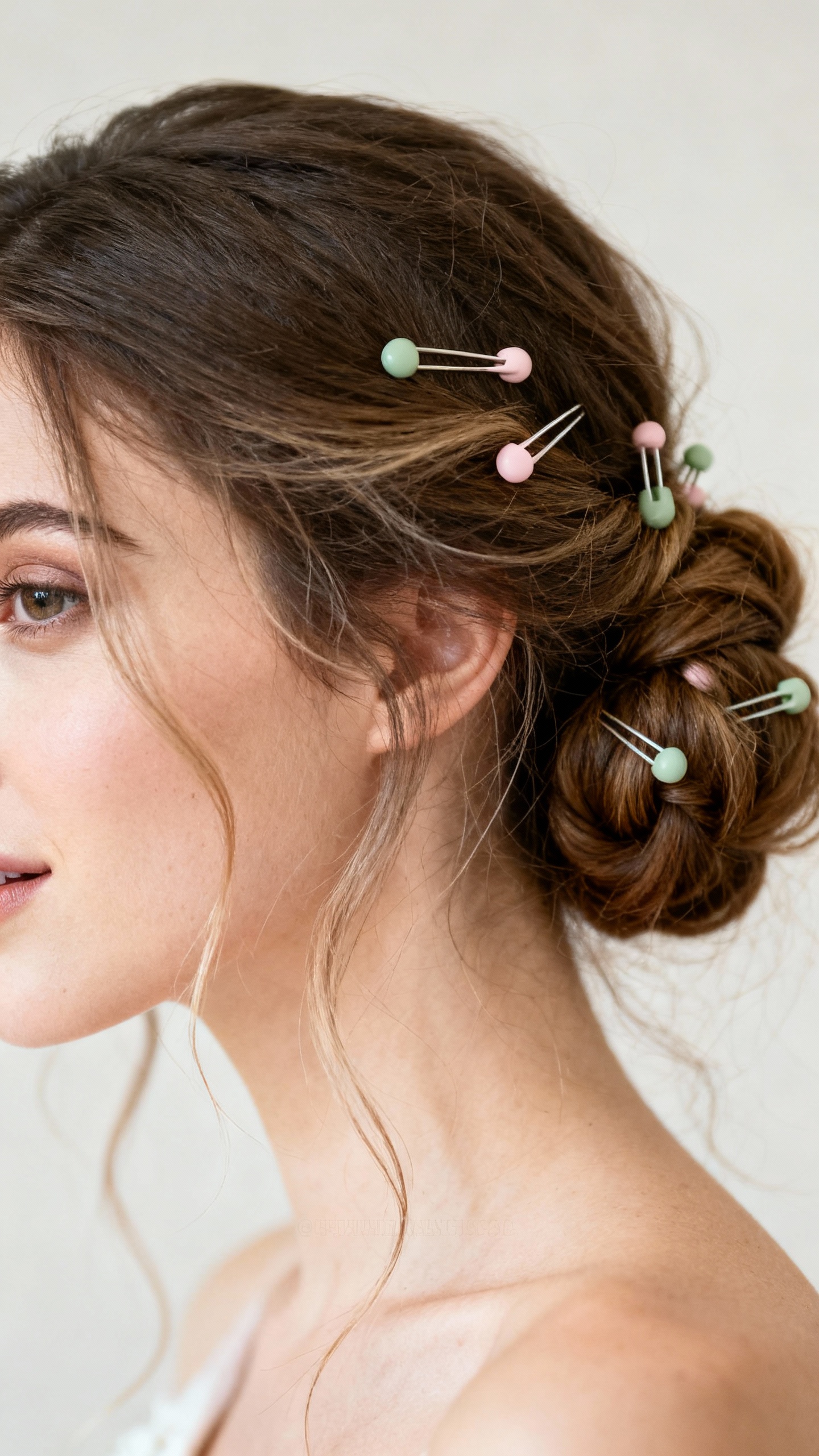 This palette is romantic and airy, and a twisted low bun matches that gentle vibe perfectly. It flatters round, heart, and oval face shapes thanks to the face-framing pieces, and it photographs beautifully from every angle in group shots. Keep the texture soft (not crunchy) by prepping with a light mousse and finishing with a flexible-hold hairspray. Practical tip: place small pearl pins or tiny floral clips on the bun’s “twist line” so the accessories look intentionally matched across the bridesmaids.