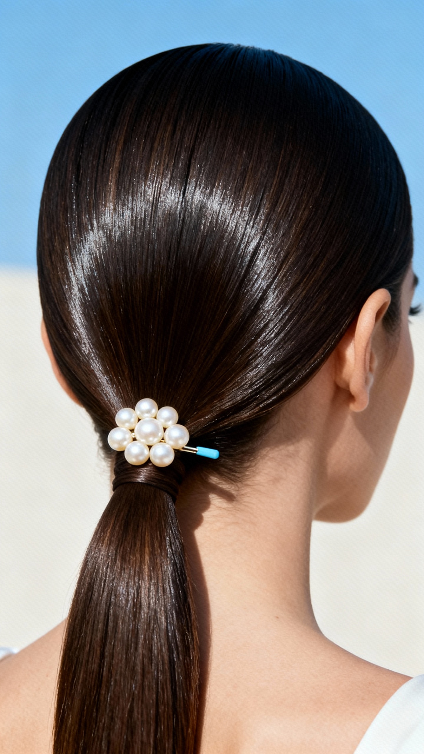 3) Sky Blue + Ivory: Sleek Low Pony with a Pearl Barrette