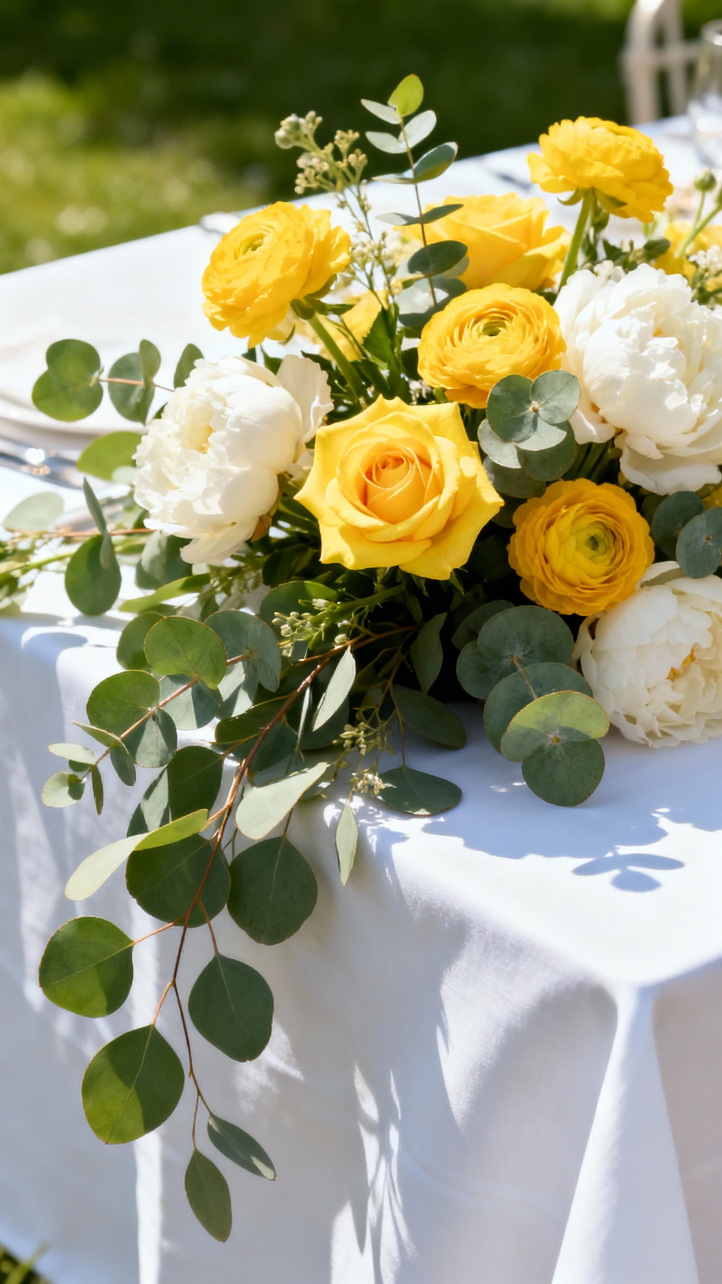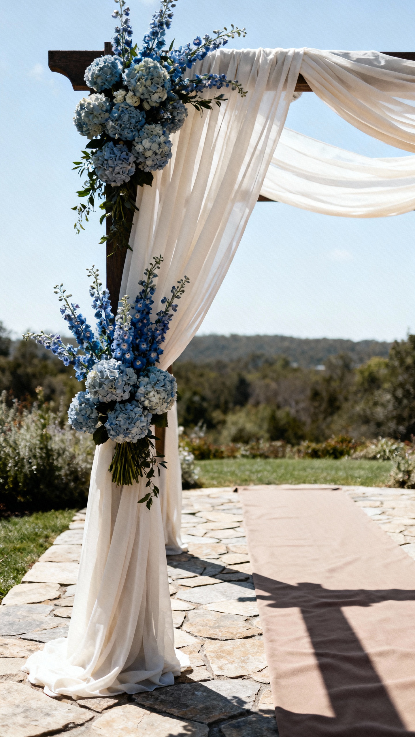 Soft but saturated tones tend to photograph beautifully: dusty blues, lavenders, sage greens, blush with a deeper accent (like terracotta), and buttery yellows. Ask your florist for blooms with dimension (multiple tones in one flower) so arrangements still look rich in full sun.