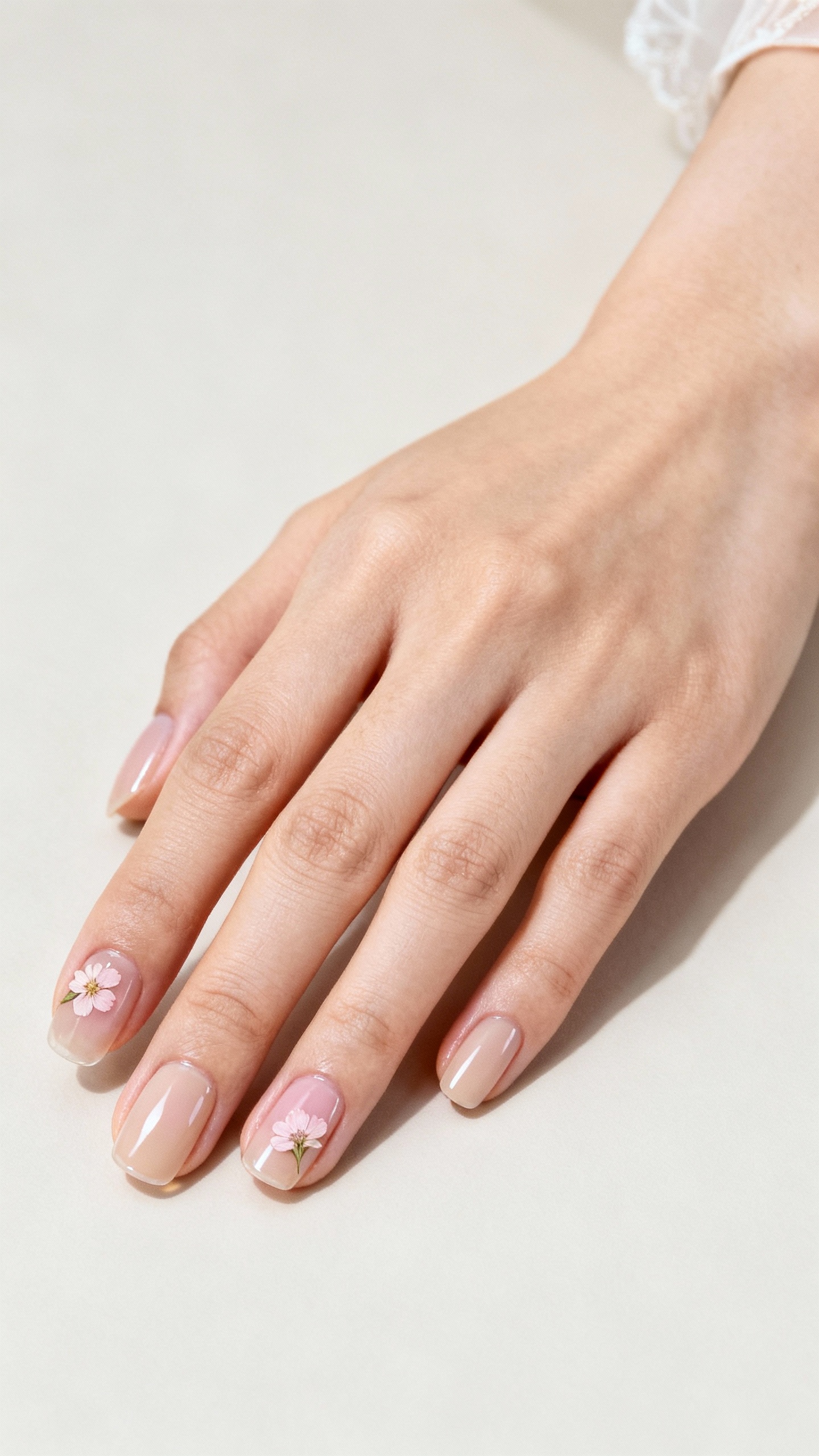 Inspired by real pressed flowers, this look uses a sheer nude or soft pink base with one or two delicate “pressed” floral accents encapsulated under a glossy topcoat. The key is spacing: think airy placement on 2–3 nails max, not a full bouquet on every finger. Medium almond or squoval keeps it elegant and wearable. Wear tip: ask for encapsulation (builder gel or acrylic) so the design stays smooth and snag-free on lace, tulle, and hair.
