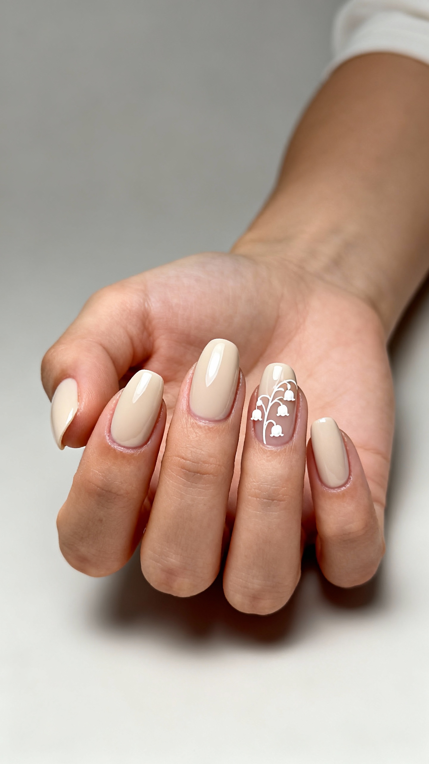 Lily-of-the-valley is the ultimate spring bridal flower, and line art keeps it chic: tiny white stems with mini bell blooms over a milky nude base. It’s crisp, photo-friendly, and gives “garden ceremony” without overwhelming your ring shots. Best on short-to-medium oval or squoval for a polished, put-together look. Wear tip: finish with a high-gloss no-wipe topcoat (especially in gel) so the white stays bright and doesn’t dull in flash photos.