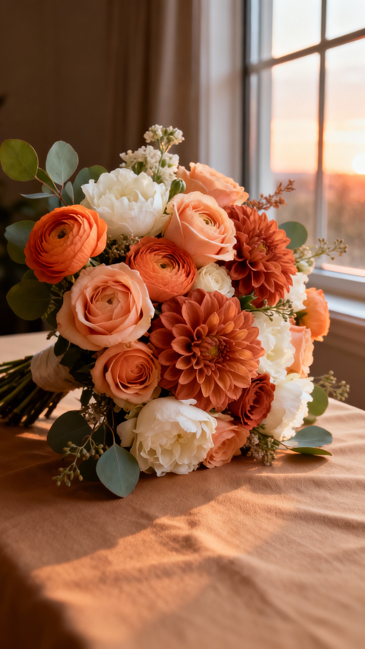 Peachy bouquets are flattering, cheerful, and still totally wedding-appropriate when you add a muted terracotta note. Keep the tones “sunset-y” instead of neon: apricot ranunculus, peach roses, and a few terracotta accents (dahlias in season, or toned carnations) with ivory blooms to calm it all down. It’s perfect for outdoor ceremonies and pairs beautifully with warm neutrals in your decor.