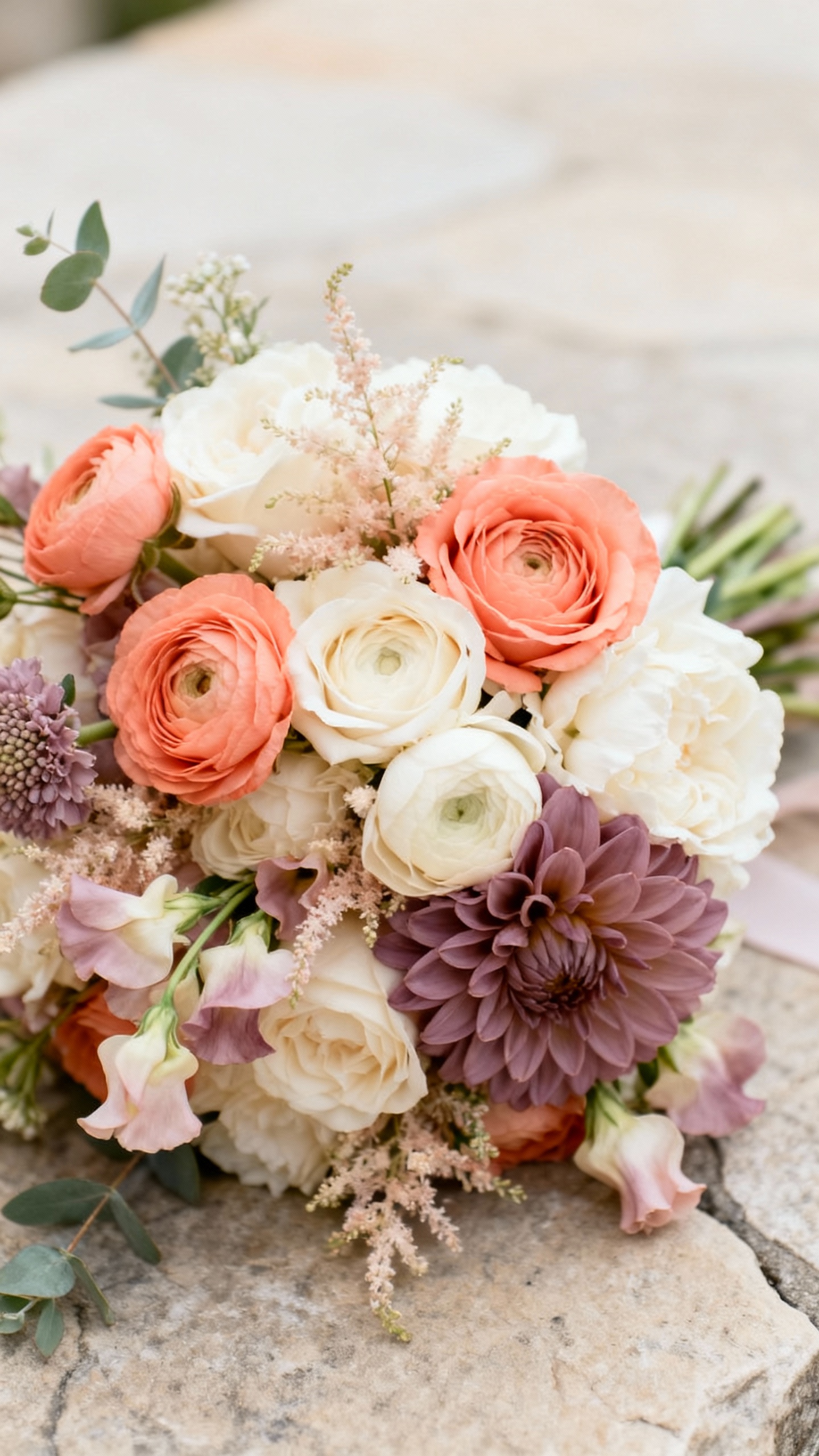 This is for the couple who wants color, but not chaos. Soft coral brings warmth, cream keeps it bridal, and a touch of muted plum adds depth so it doesn’t read too sugary. Request a gradient effect (coral to blush to cream) with just a few plum accents—like scabiosa or sweet pea—so the bouquet feels curated, not cartoonish.