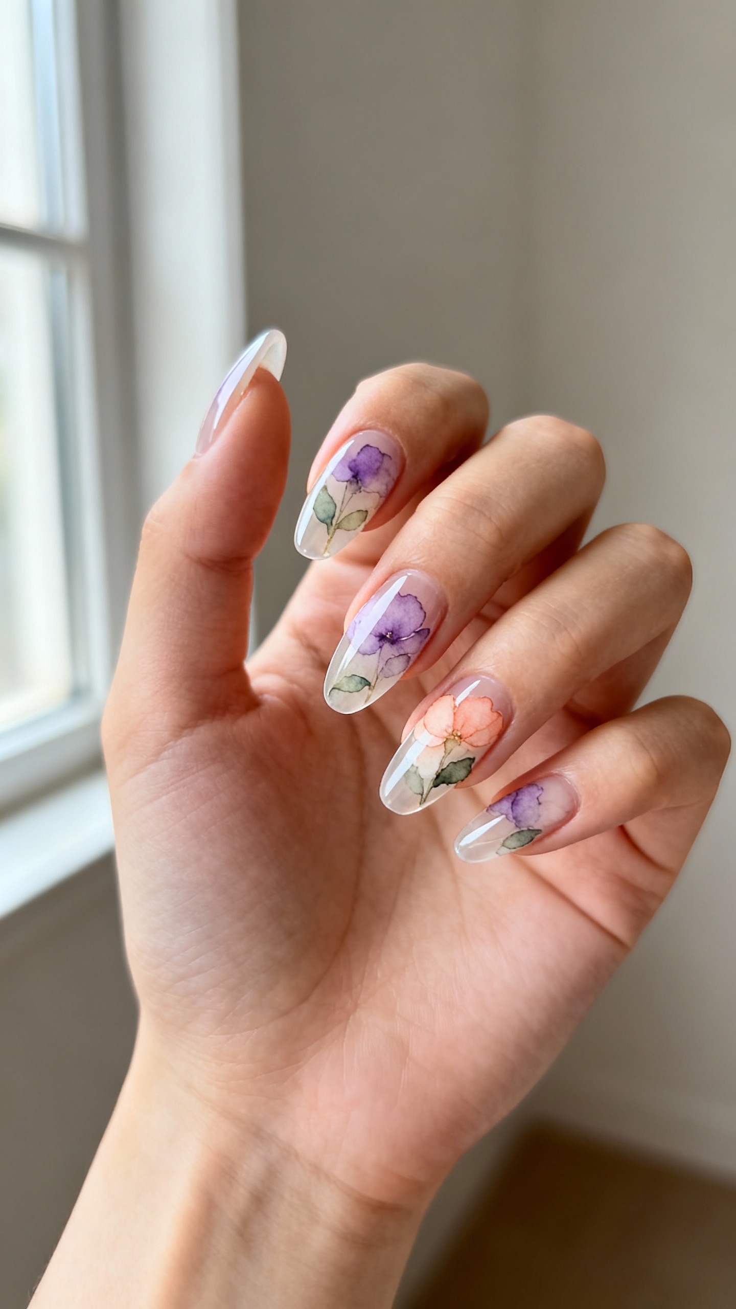 If you love color but still want soft, watercolor wildflower nails are that perfect “painted by sunlight” moment. Go for a sheer neutral base with blurred washes of lilac, soft peach, and leaf green, then add the faintest floral silhouettes—more impressionist than literal. Medium length almond or ballerina works best because the extra space lets the watercolor blend breathe. Wear tip: opt for builder gel if you’re hard on your hands; it protects the layered art and keeps the surface smooth and glossy longer.