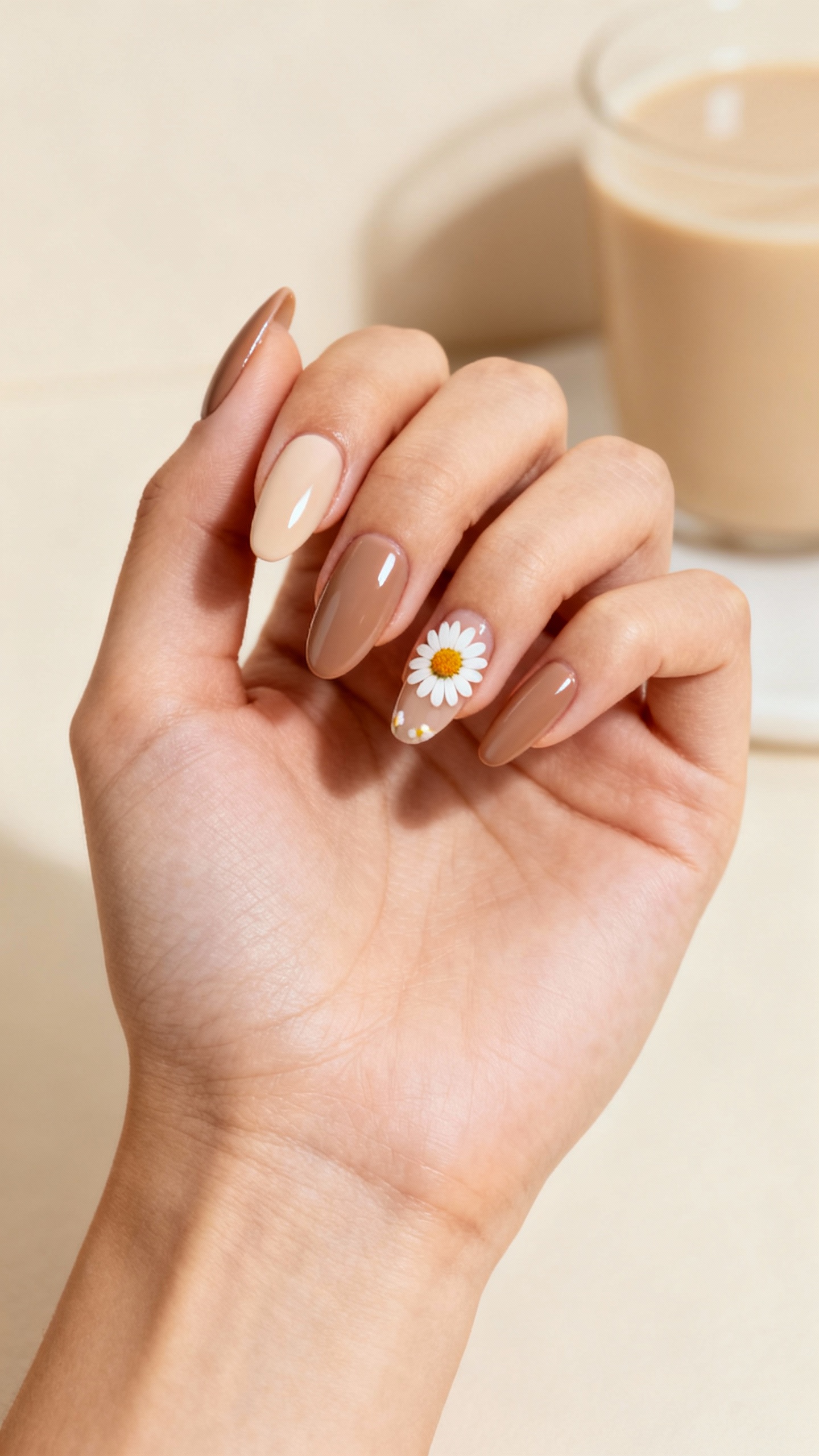 This set is for the neutral bride who still wants a wildflower nod: warm beige, oat milk, and creamy latte tones with tiny white chamomile-style daisies. It matches basically any spring bouquet because it plays nice with greens and pastels without fighting them. Try short oval or short almond for an expensive, minimalist finish that still feels special up close. Wear tip: cuticle oil twice daily makes neutral sets look freshly done for longer (and it helps your rings and detail shots look extra polished).
