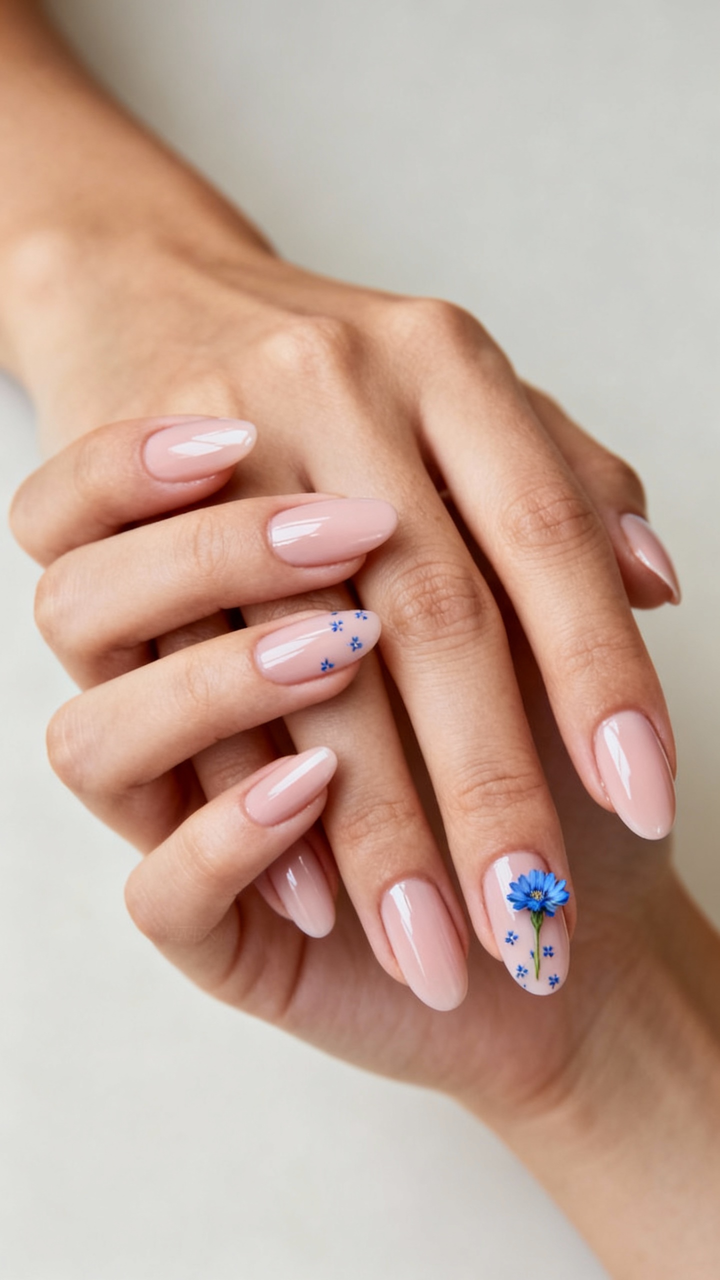 For a subtle bridal tradition moment, keep most nails a soft blush nude and add one or two cornflower-blue accents—either a single wildflower on the ring finger or tiny blue buds scattered on one hand. The color nods to spring bouquets with delphinium, cornflower, or forget-me-not vibes, but the overall look stays calm and elegant. Best on medium almond or oval so the accent art has room without feeling loud. Wear tip: if you’re torn between gel and acrylic, gel is usually the go-to for this kind of fine-line floral art because it cures crisp and resists smudging.
