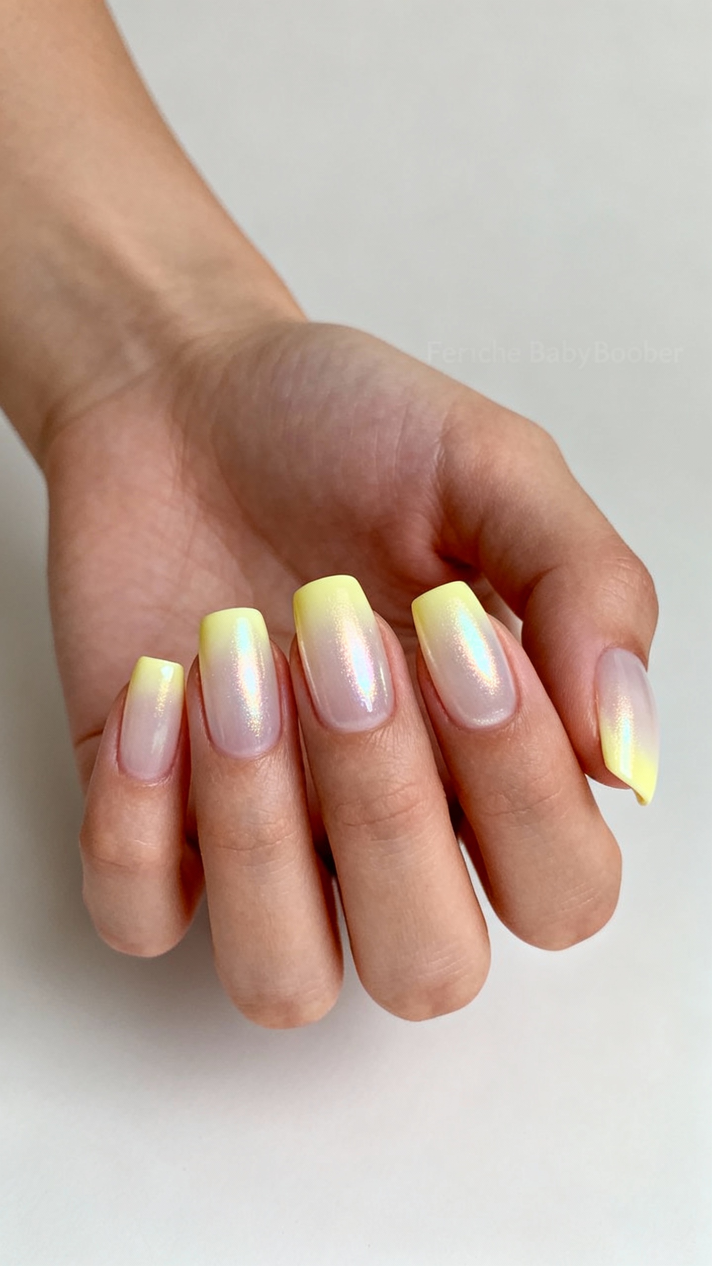 This is a modern “citrus bride” take on classic nails: a sheer milky base melting into a soft lemon tip, finished with a subtle pearl chrome glow. It reads bright in sunlight but still elegant for vows, especially on short-to-medium almond or soft square. Go gel for the cleanest fade and ask for a builder gel overlay for extra chip resistance during travel and pre-wedding errands.