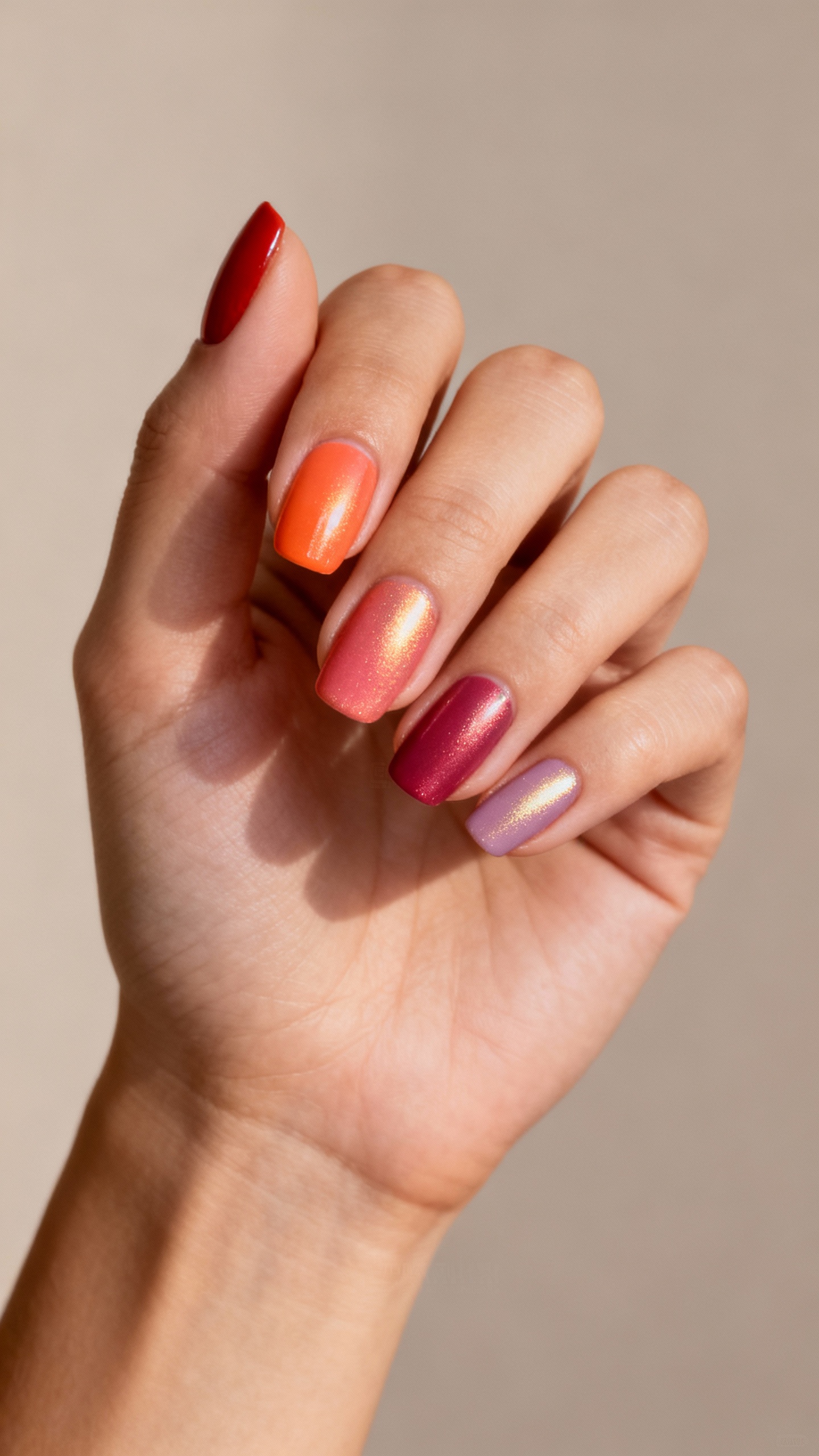This is sunset turned up, but still wedding-polished: each nail shifts through a coordinated palette—blood orange, warm coral, rosy berry, and a mellow mauve—tied together with a soft champagne chrome or glazed finish. It’s ideal for longer almond or tapered square if you want that “main character hands” moment while holding a bouquet. For longevity, ask your nail tech to keep the shades in the same undertone family (warm-leaning) and use a rubber base gel to prevent edge chipping, especially if you’re doing a lot of packing and decorating.