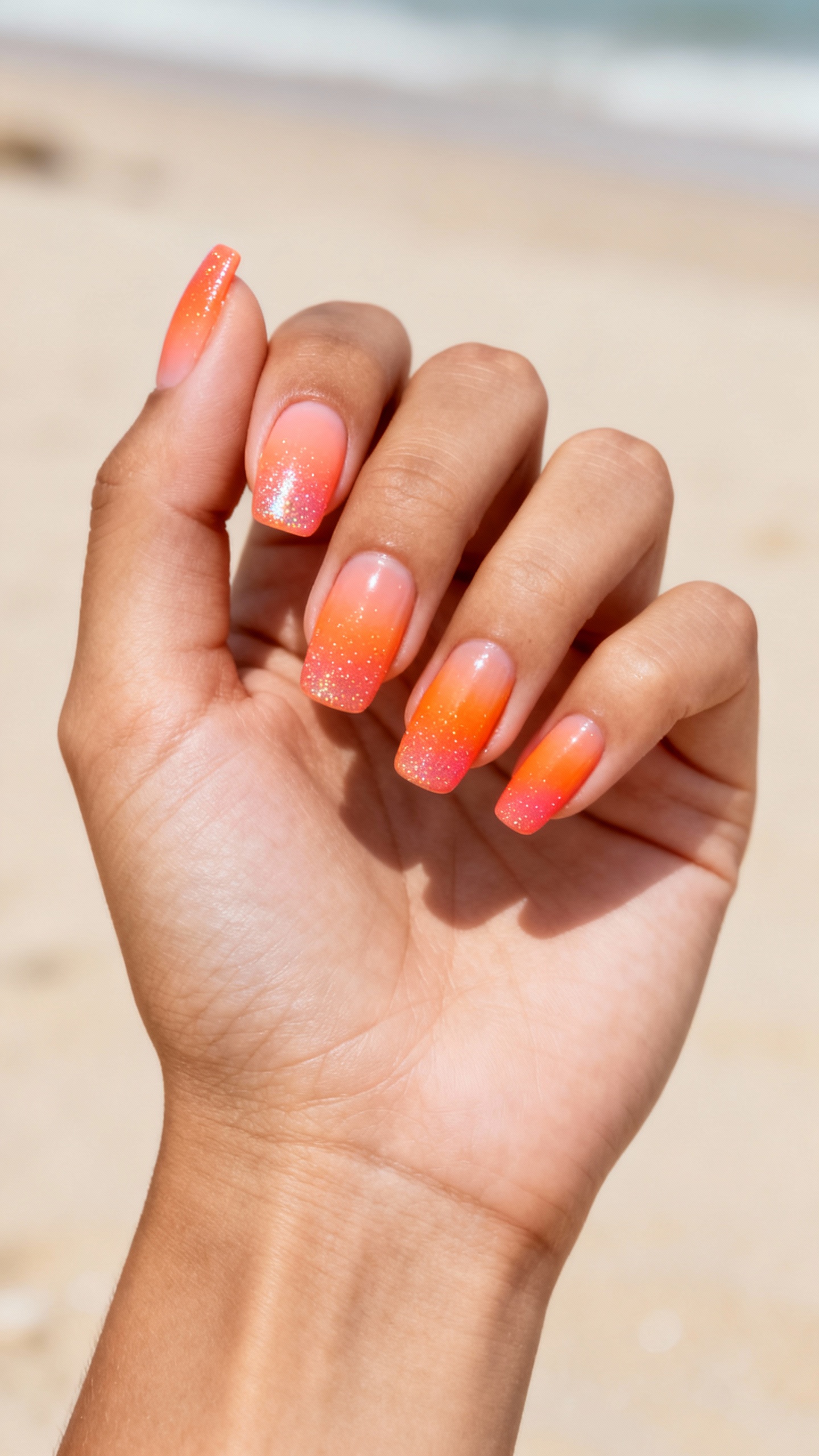 2) Tangerine Sunset Ombré with Micro-Glitter Veil
