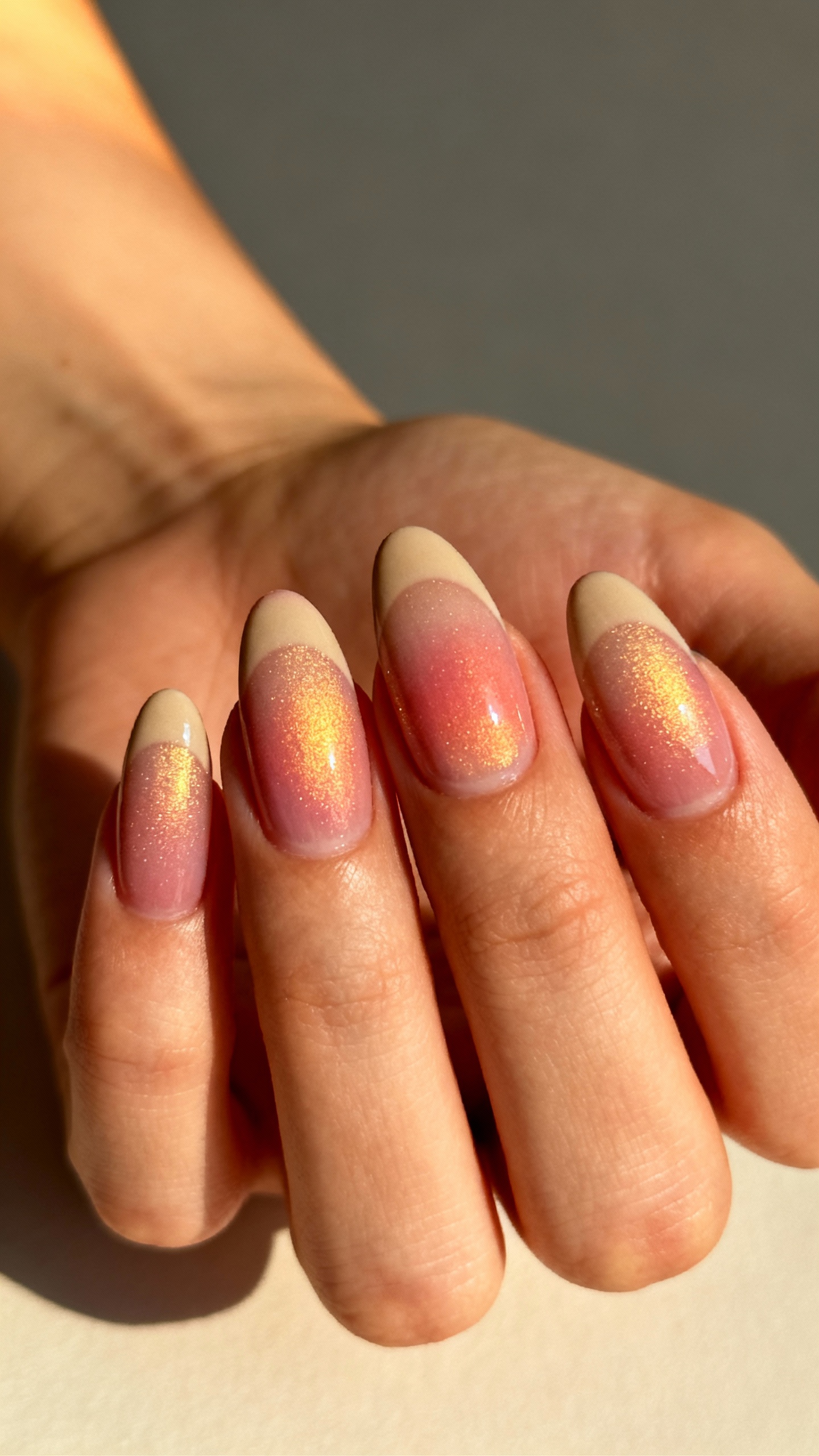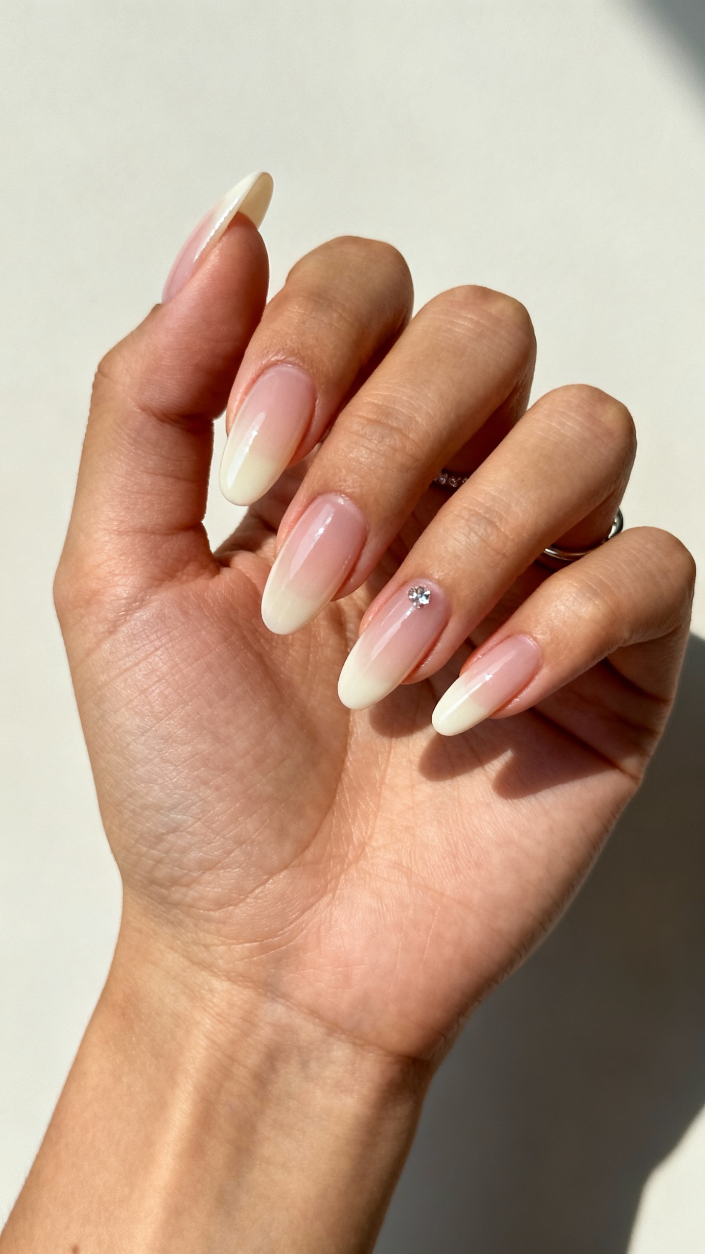 An aura blush center (soft pink fading into a nude edge) gives romantic, just-married energy and looks unreal in golden-hour lighting. Color direction: choose rose, dusty pink, or peachy blush depending on your bouquet and lip color. Short to medium almond keeps it modern and wearable, especially for outdoor ceremonies. Practical tip: add a micro-shimmer top (not chunky glitter) to blur tiny imperfections and reduce the look of tip wear in close-up photos.